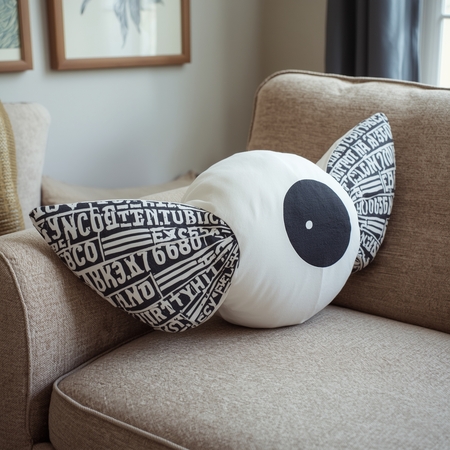 Промт для декоративной подушки: Make a decorative pillow of a character that looks like a flying eyeball with wings that consist of black printed font, completely preserving its appearance. The pillow should be in the shape of this character and so that Dadaism is transmitted. Also make a background to make the pillow look like it’s lying on the couch.