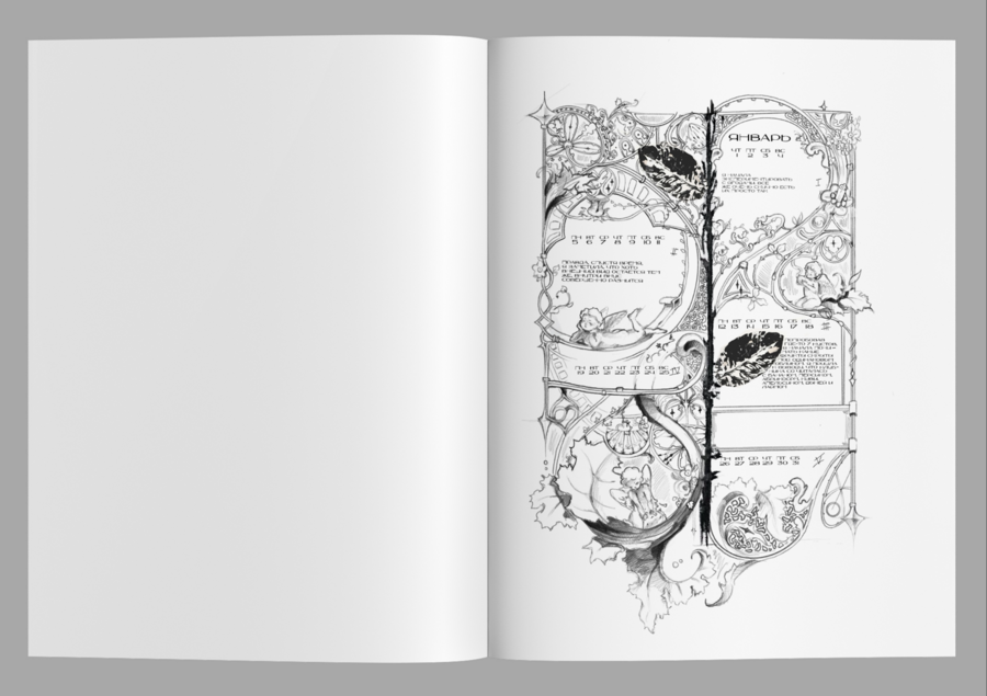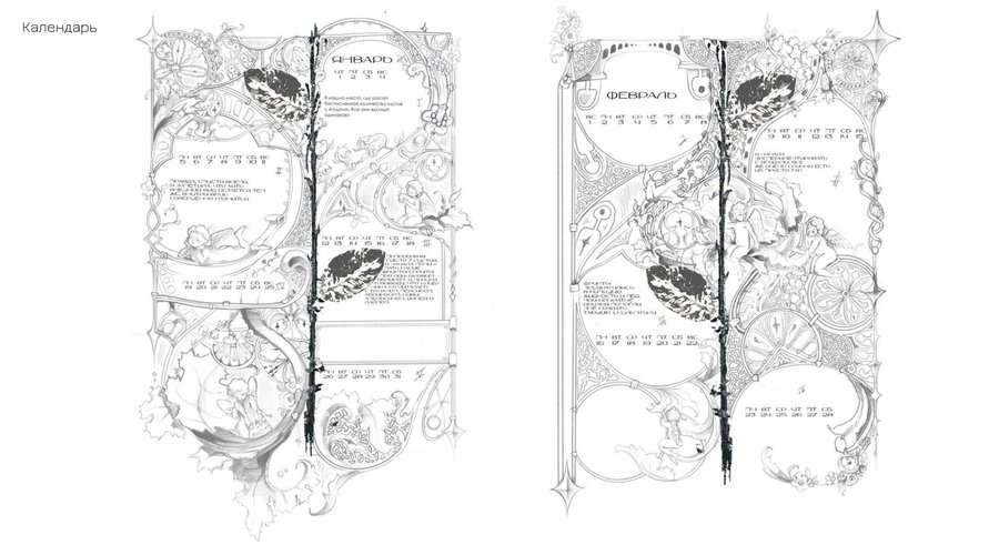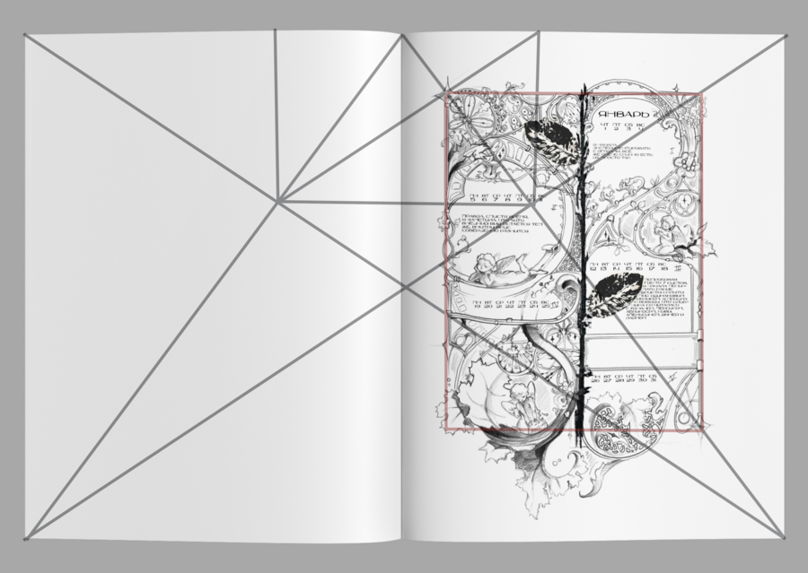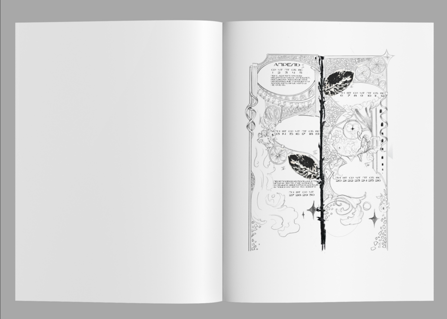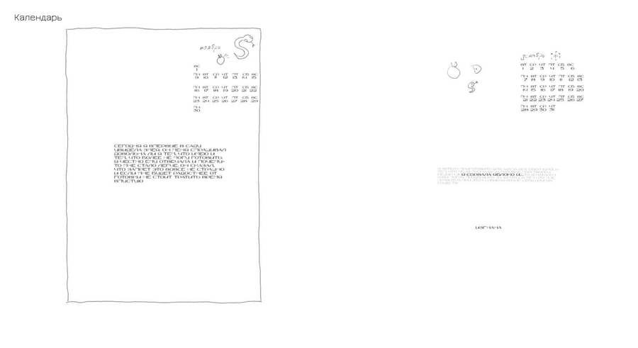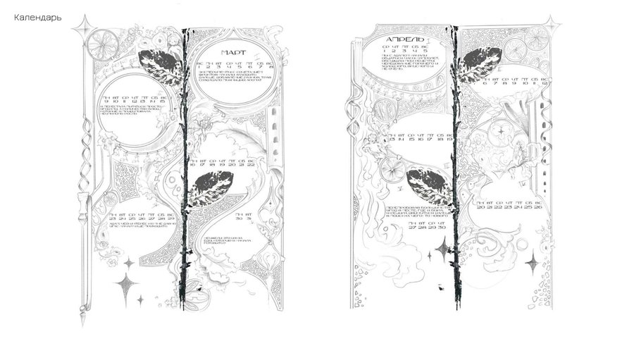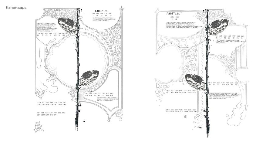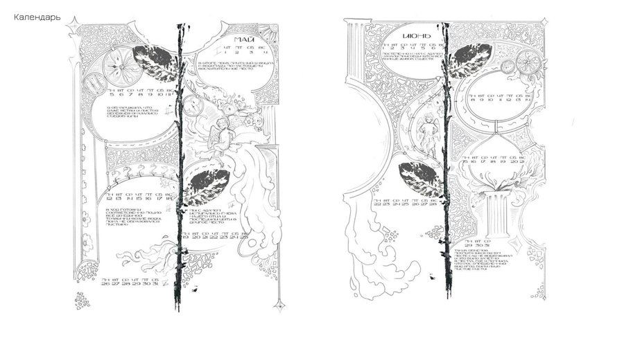 Основой сетки стало золотое сечение — символ божественной гармонии. Оно пришло из старых книг, когда было еще актуально спасать записи от крыс. В мокапах показаны 3 примера из основных блока календаря: самый первый — божественный, второй — разрушающийся, последний — окончательно разрушенный.