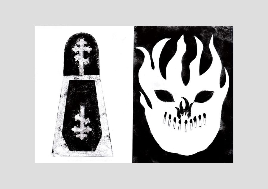 /image prompt: A flat lay photograph showcasing two distinct door hangers for the 'ONO' brand, both featuring the classic cut-out hook at the top for hanging on a doorknob. Door Hanger 1 (Foreground, slightly angled): This door hanger is made of matte black cardstock. It features a prominent, minimalist white line-art illustration inspired by the psychological themes of your brand. This illustration could depict a stylized, abstract figure grappling with shadows, or a subtle, integrated representation of the eye or hand symbol from your 'ONO' logo. In bold, stark white, sans-serif typography, a short, impactful phrase like 'INNER SPECTER' or 'BEWARE THE FEAR' is centrally placed. Small, textural details reminiscent of linocut or woodcut prints are visible in the white lines. Door Hanger 2 (Background, slightly overlapping or adjacent): This door hanger is made of off-white or light grey cardstock. It features a detailed, high-contrast black line-art illustration in the style of your Image 2 graphics (e.g., a stylized, less aggressive version of the flaming skull mask, or a more narrative depiction of the cross-keyhole design). Above or below the main illustration, in clean, sans-serif black typography, is another short, thought-provoking phrase related to the brand, such as 'STAY AWAY' or 'CONFRONT YOURSELF'.