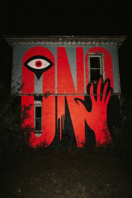 /image prompt: A dramatic, wide-shot photograph of an old, slightly dilapidated two-story house, situated in a somewhat overgrown, melancholic setting. The house’s exterior is painted a faded, somber color — perhaps a desaturated, dusty grey-blue or an aged off-white, conveying a sense of forgotten history or quiet despair. The paint is subtly peeling in places, adding to its worn appearance. Across the entire front facade of the house, spanning both floors and covering windows, is a massive, bold, and starkly rendered message: the word 'ONO'.