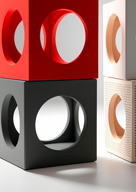 1. Generate four 40 cm wooden cubes arranged in a spacious photo studio on a white background. The first cube is gray with a large round through hole. The second cube is red with a vertical partition in the center. The third cube is white with perforated stripes on the surface. The fourth cube has no holes and is black in color. There is nothing else in the picture. 2. Generate an office interior in industrial style. The interior has brick walls and concrete columns, matte black floor and large panoramic windows, behind which you can see the gray street. In the office there are desks of employees, there are no people in the picture. 3. Minimalist logo, the sign looks like a square with a large circle in the center. The logo is inserted in the name BLOCKS instead of the letter O. The fonts are laconic and geometric.