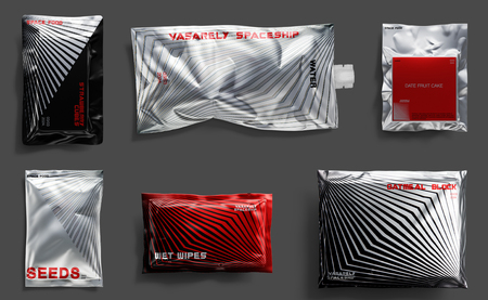Promt: Generate food for astronauts in special processing: frozen, vacuum packed with a design based on the work of Victor Vasarely, reminiscent of the era of the 60s, the aesthetics of futurism and space. The design contains metal elements. Colors: red, black and white. The packaging should have a futuristic logo for the Victor Vasarely space nutrition brand «VasarelySpace"The brand produces various space meals for both astronauts and visitors to the personal exhibition of the artist Victor Vasarely «Vasarely spaceship». The color palette: red, black, white. The logo combines abstract, geometric shapes, optical effect and aesthetics of futurism and space.