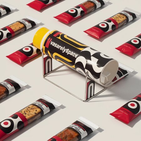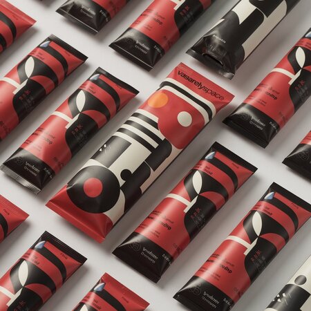 Promt: Generate food for astronauts in tubes with a design based on the work of Victor Vasarely, reminiscent of the era of the 60s, the aesthetics of futurism and space. The design contains metal elements. Colors: red, black and white. The packaging should have a futuristic logo for the Victor Vasarely space nutrition brand «VasarelySpace"The brand produces various space meals for both astronauts and visitors to the personal exhibition of the artist Victor Vasarely «Vasarely spaceship». The color palette: red, black, white. The logo combines abstract, geometric shapes, optical effect and aesthetics of futurism and space.