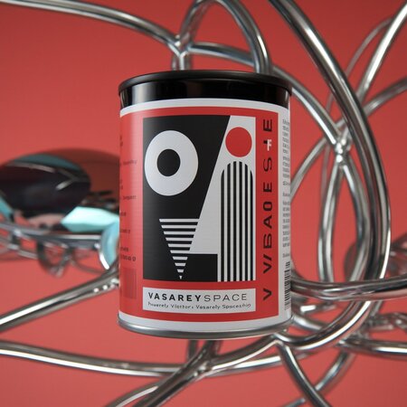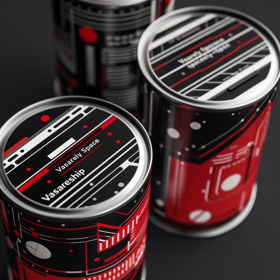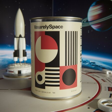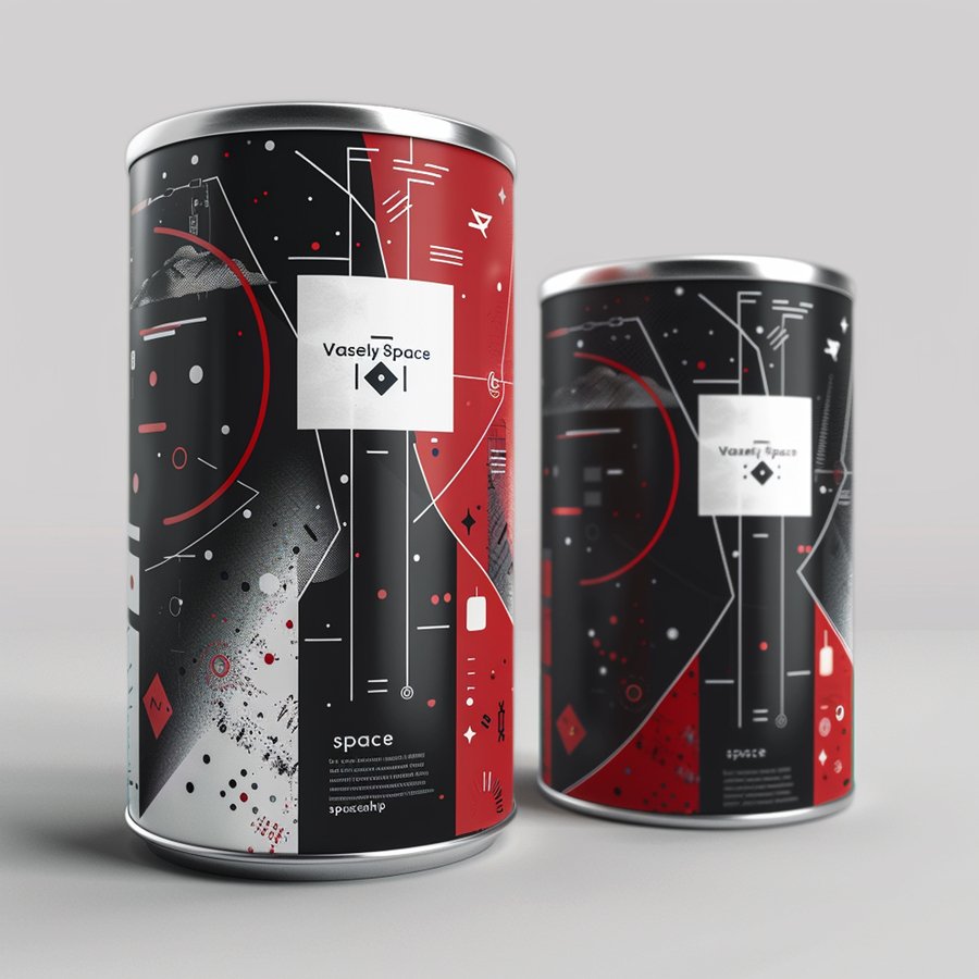 Promt: Generate food for astronauts in the form of a tin can with a design based on the work of Victor Vasarely, reminiscent of the era of the 60s, the aesthetics of futurism and space. The design contains metal elements. Colors: red, black and white. The packaging should have a futuristic logo for the Victor Vasarely space nutrition brand «VasarelySpace"The brand produces various space meals for both astronauts and visitors to the personal exhibition of the artist Victor Vasarely «Vasarely spaceship». The color palette: red, black, white. The logo combines abstract, geometric shapes, optical effect and aesthetics of futurism and space.