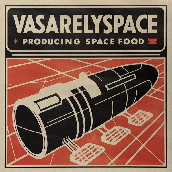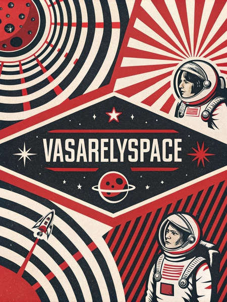Promt: An advertising poster for «VasarelySpace» space food products in the style of the era of the 60s and futurism. Colors: Black, White, Red