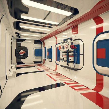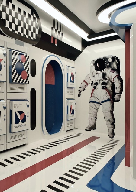 Promt: Generate a space food store «VasarelySpace». A spacious store in a futuristic style, reminiscent of the work of Victor Vasarely: optical illusions and abstract geometric shapes, bright colors. The space food store vaguely resembles the side of a spaceship. Combines an abundance of metallic materials, glossy surfaces, cool shades and tones. The store’s colors are white, black, red and blue. The store’s products, space food with a design based on the work of Victor Vasarely, reminiscent of the era of the 60s, the aesthetics of futurism and space. The design contains metal elements. Colors: red, black and white. The packaging should have a futuristic logo for the Victor Vasarely space nutrition brand «VasarelySpace"The brand produces various space meals for both astronauts and visitors to the personal exhibition of the artist Victor Vasarely «Vasarely spaceship». The color palette: red, black, white. The logo combines abstract, geometric shapes, optical effect and aesthetics of futurism and space. The goods are stored in lockers similar to special on-board refrigerators in which astronauts store food. The store also has an installation of an astronaut in a spacesuit.