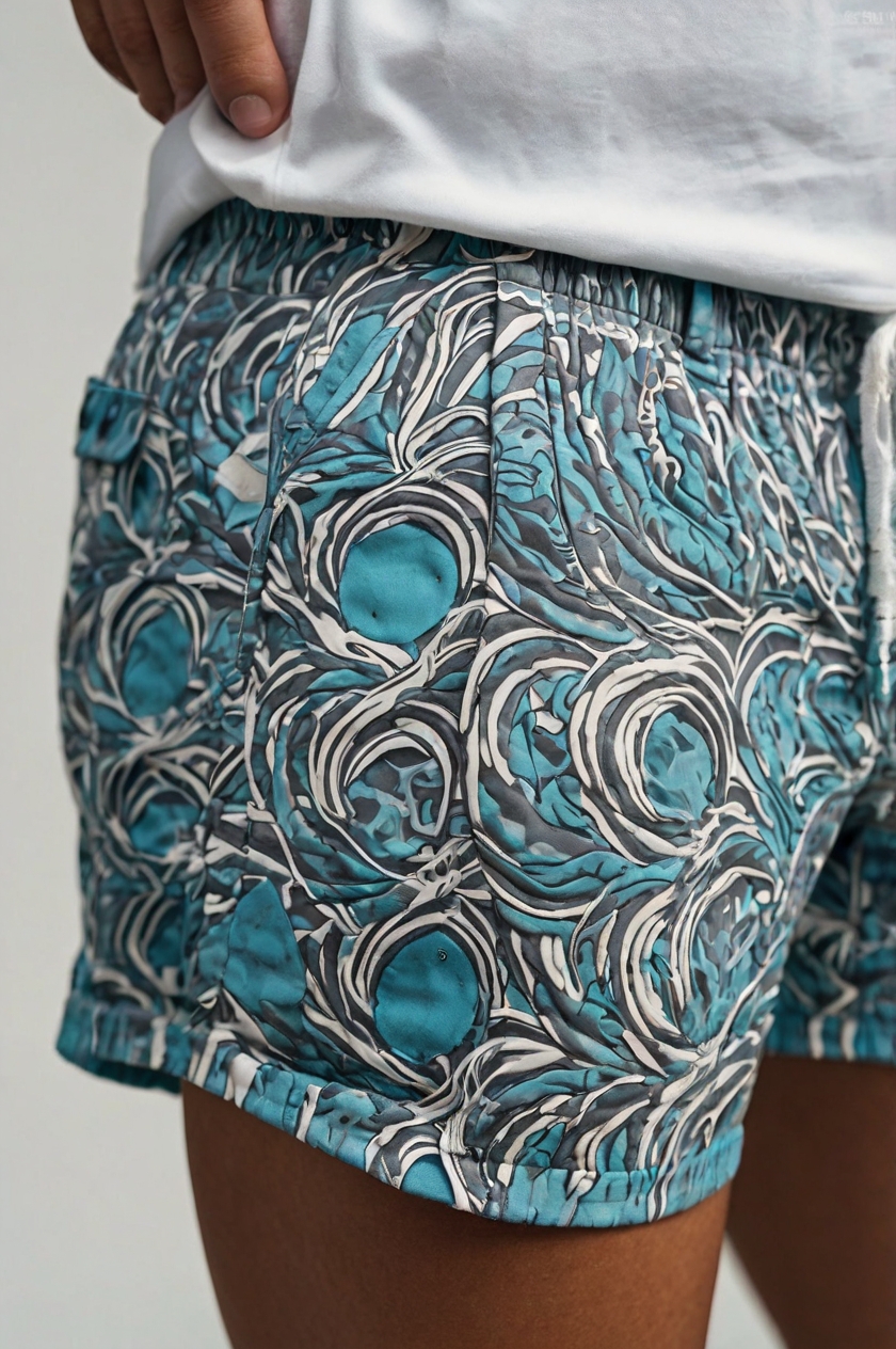Leonardo AI: «Create clothing options for the youth eco-brand VNATURE, which produces clothes from recycled fabric.Create drawstring shorts in a soft blue or gray, using recycled fabric. Add a textured or embossed wave pattern along the lower half of the shorts to give a subtle ocean-inspired look. The shorts should feel casual and comfortable for a beachy, youthful vibe»