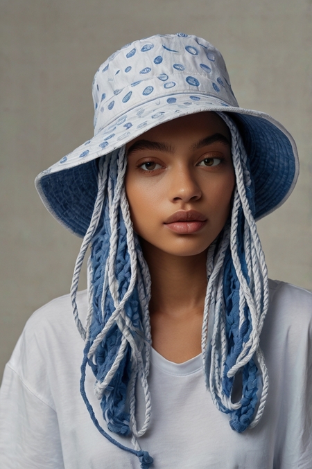 Leonardo AI: «Create clothing options for the youth eco-brand VNATURE, which produces clothes from recycled fabric. Design a bucket hat in light gray or blue with small, embroidered wave patterns around the brim in white or darker blue. Use recycled fabric to make the hat durable but lightweight. a minimalist style, fitting with the hat’s laid-back, trendy look»