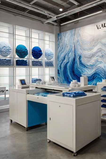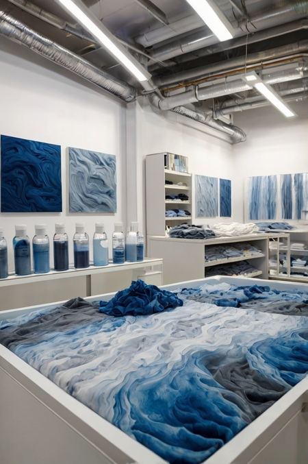 Leonardo AI: «eco-brand VNATURE, which makes clothing from recycled fabric. white, gray and blue colors. Picture an eco-friendly dyeing station that uses non-toxic, water-saving techniques. In this section, recycled fabrics are dyed in soft shades of blue and gray. Natural light floods the space, which is ventilated to ensure minimal environmental impact. Nearby, a digital printing station produces VNATURE’s wave-inspired designs using water-based, eco-conscious inks.»