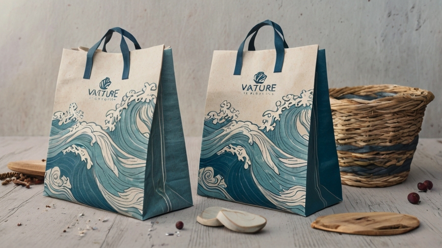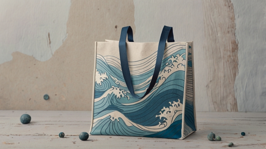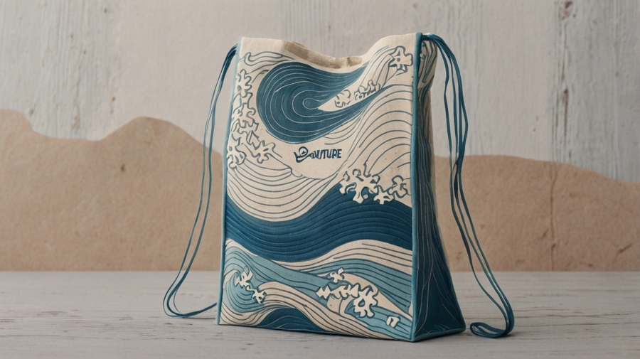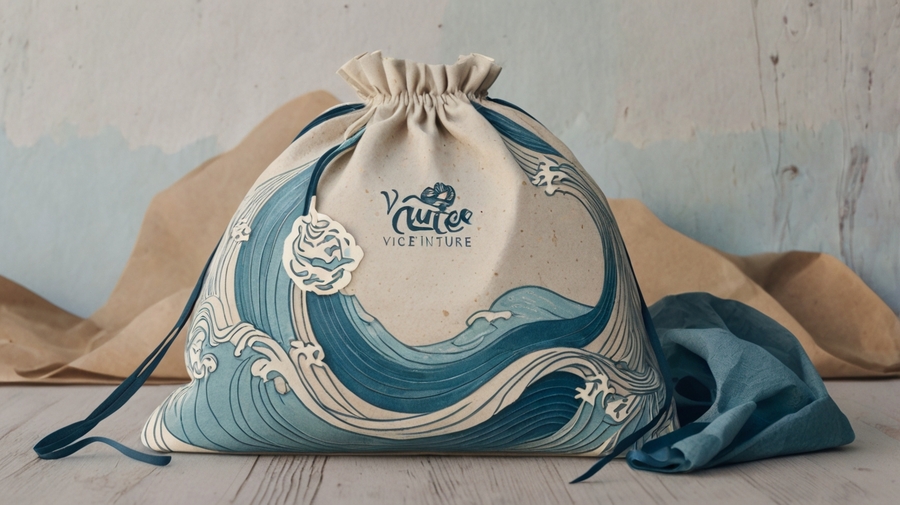 3. Reusable Fabric Bag: Wrap the clothing in a reusable fabric bag made from recycled materials, perhaps in a gray or soft blue shade. Print delicate, flowing wave designs across it. This bag could serve as a convenient accessory for customers, encouraging them to avoid single-use plastic.»