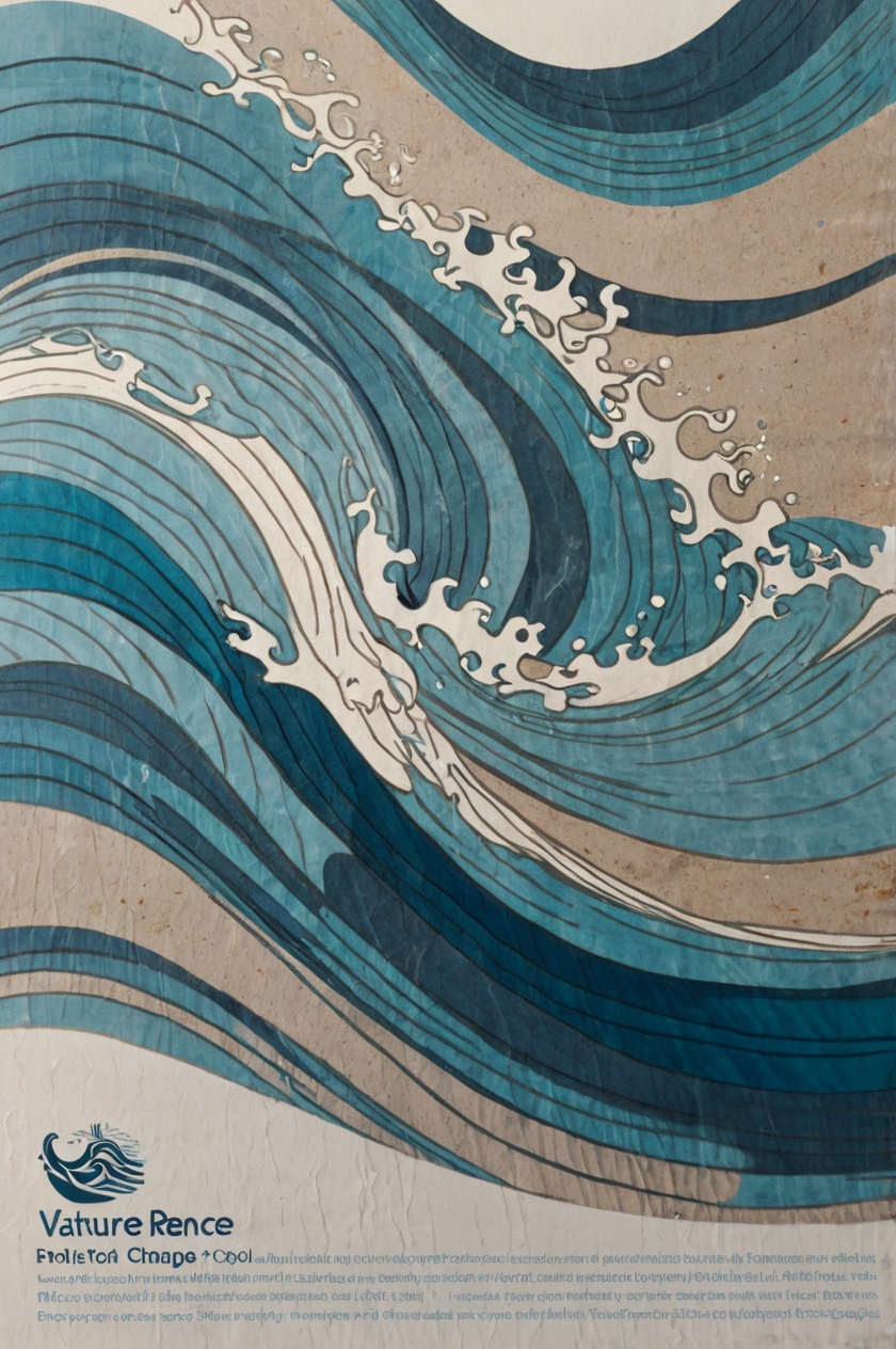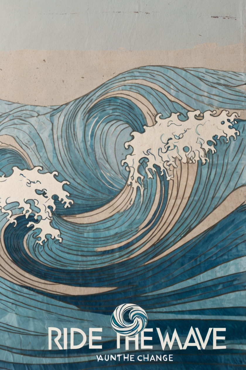 «Design a minimalist poster with abstract ocean waves in white, gray, and blue, symbolizing change and movement. Use layered, flowing wave shapes that resemble recycled fabric coming together. The main text reads 'Ride the Wave of Change, ' in a modern, bold font. Add a small QR code or link at the bottom, encouraging viewers to learn more about VNATURE’s sustainable mission.»