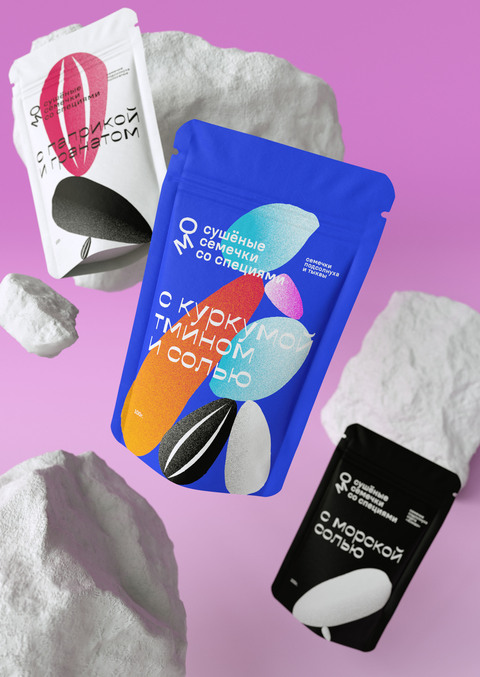 The basis of the graphic elements is the metaphor of balance and peace, since OM snacks will not harm your health and will help relieve stress.