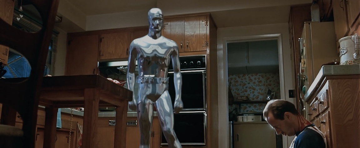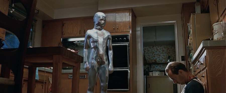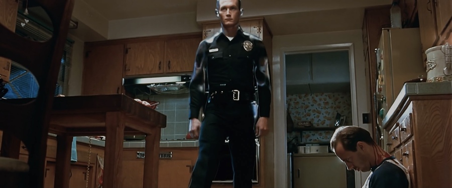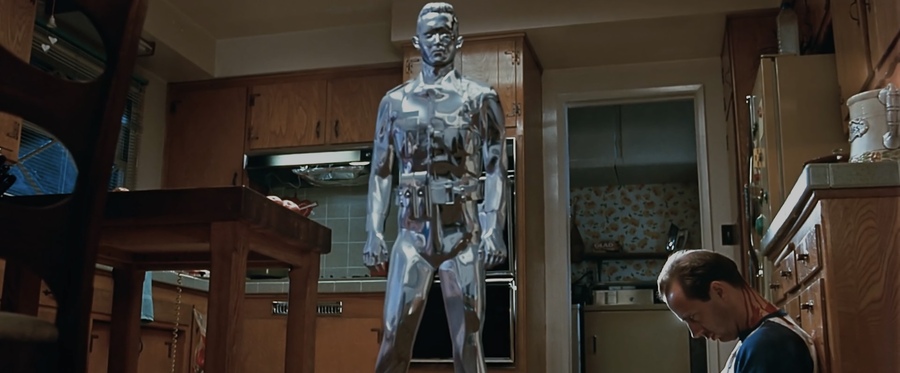 ILM под руководством Денниса Мерена сняла два идентичных кадра на motion-control камере: сначала актрису Дженетт Голдстин, потом Роберта Патрика в блестящем костюме. Оба изображения были оцифрованы и сведены через цифровой морфинг (программа Elastic Reality), где постепенно менялись форма и текстура тела. Финальные кадры — полностью CGI-модель Т-1000 с отражениями кухни (environment mapping).