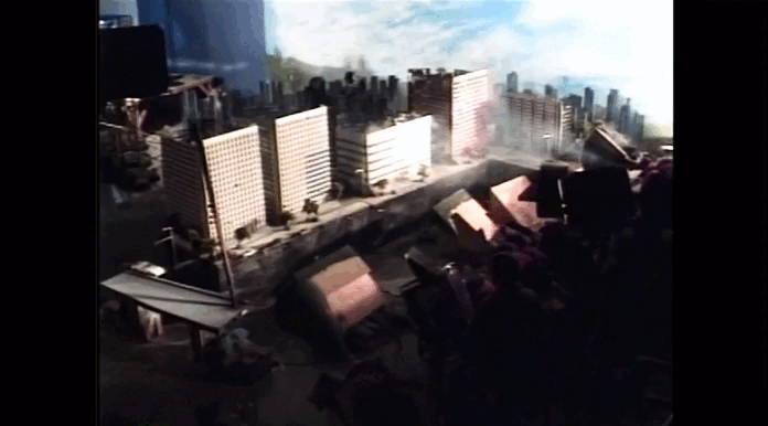 Изначально планировалось физически взорвать десятки миниатюрных небоскрёбов на фоне панорамы. Специалисты 4-Ward провели тест с одной 10-дюймовой (25 см) моделью — взрыв выглядел убедительно, но масштабировать эффект для 40 зданий было слишком затратно. Тогда братья Скотак обратились к Electric Image, где Джей Рот и Аллен Мэннинг создали 3D-модель квартала, а Марк Грэйнджер и Маркус Хой написали программу симуляции взрывной волны и обрушения. Анимацию рендерили как чёрно-белый силуэт, чтобы проще было совмещать с засвеченным кадром вспышки. В итоге эту цифровую анимацию разрушения оптически наложили между панорамами «до» и «после», визуализировав момент уничтожения города.