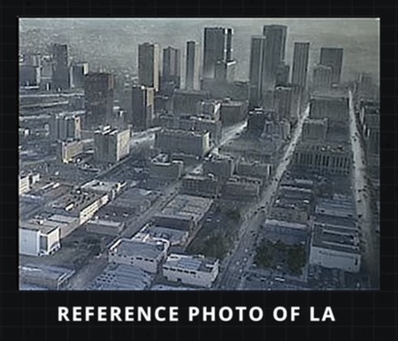 Для общего вида города применялась комбинация натурных съёмок, миниатюр и матт-пейнтинга. Оператор Деннис Скотак выполнил аэрофотосъёмку Лос-Анджелеса, после чего изображение перенесли на шестифутовый холст и дорисовали художники-матт-пейнтеры Рик Риши (Rick Rische) и Ричард Килрой (Richard Kilroy), создав два состояния кадра — «до» и «после» взрыва. Переход осуществлялся прямо в камере: вспышка служила естественным wipe-эффектом, превращая кадр в яркое свечение, после чего проявлялась разрушенная панорама. Однако требовалось показать динамику разрушений — распространение ударной волны и обрушение зданий.