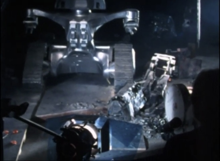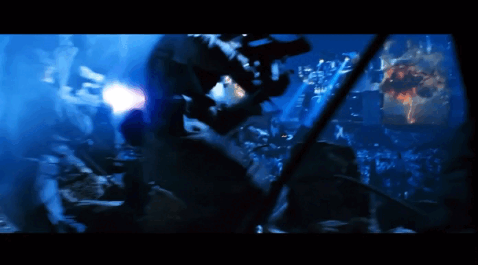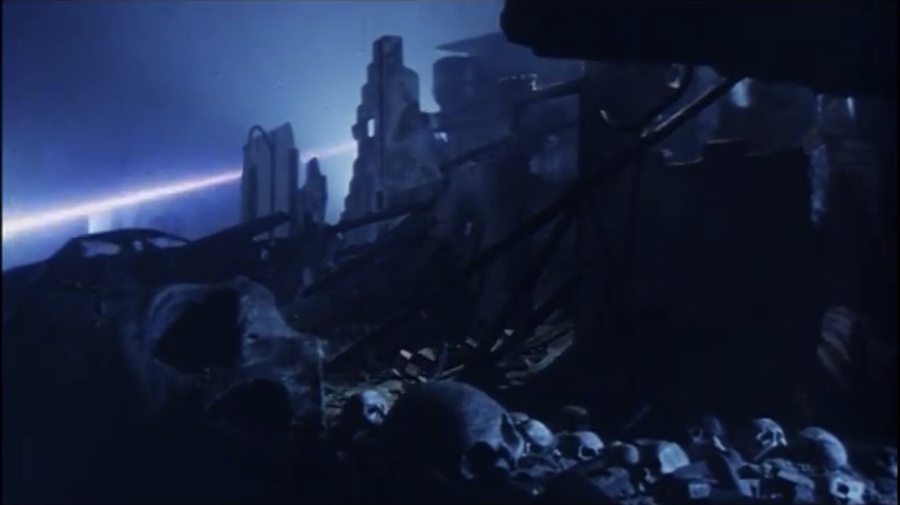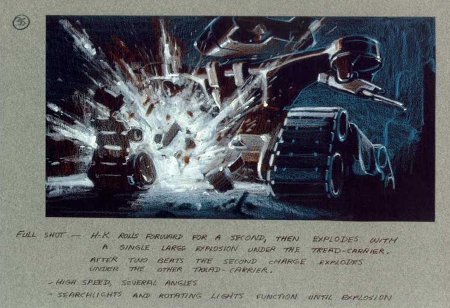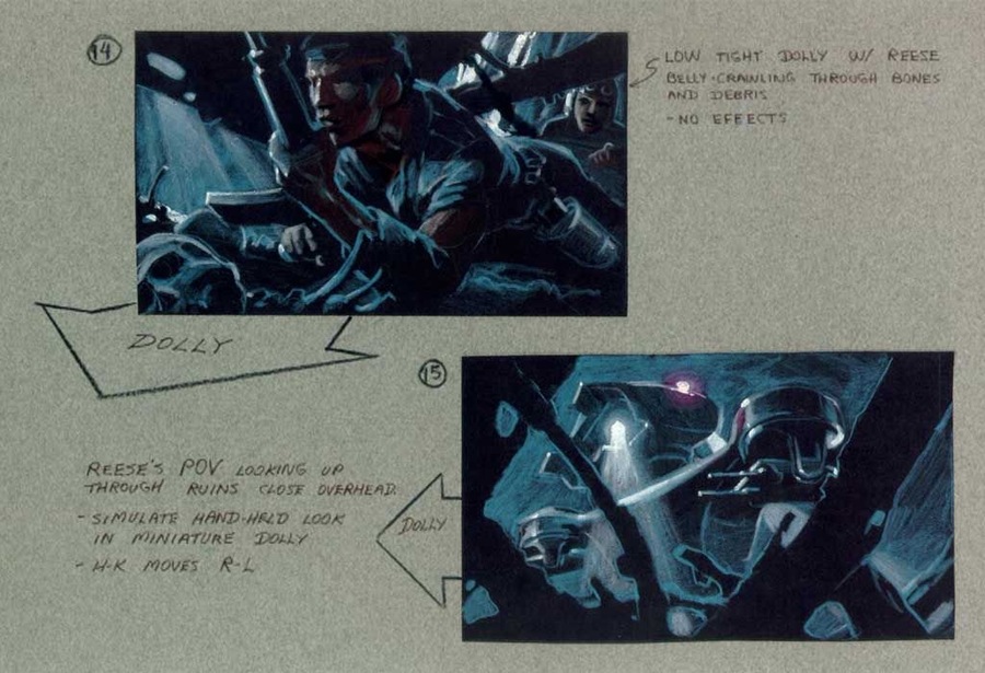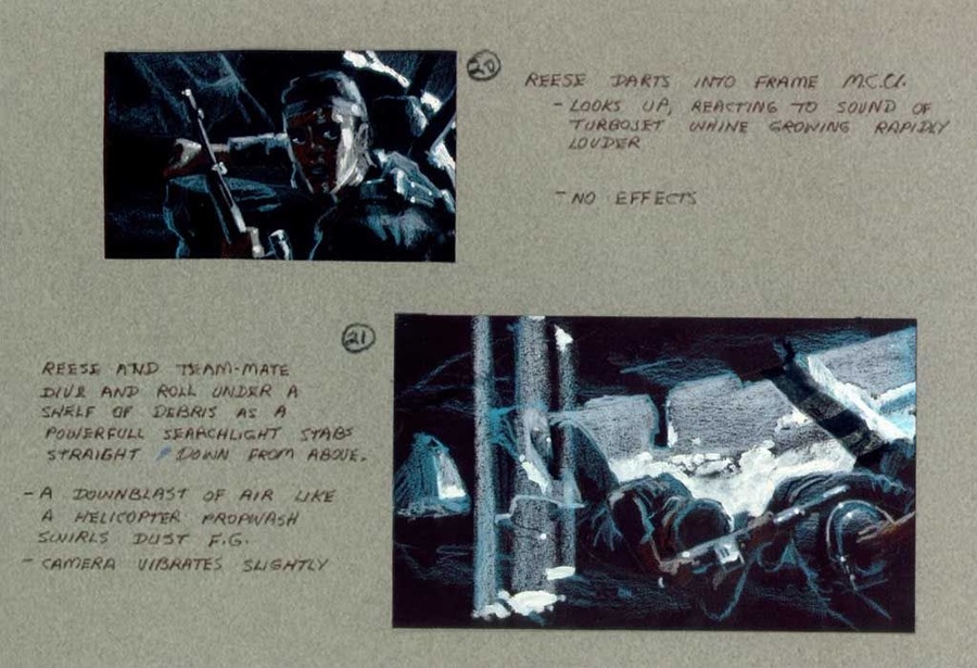 Однако в динамике Кэмерону всё ещё не хватало масштабности — он хотел видеть, как ударная волна распространяется по городу сверху. Этот эффект решили реализовать аналоговым методом: по прозрачному слою изображения города радиально провели изогнутое лезвие, как бы «смахивающее» целый город и открывающее под собой слой с руинами. Такое механическое выметание кадра имитировало фронт взрывной волны, накрывающей городской пейзаж.