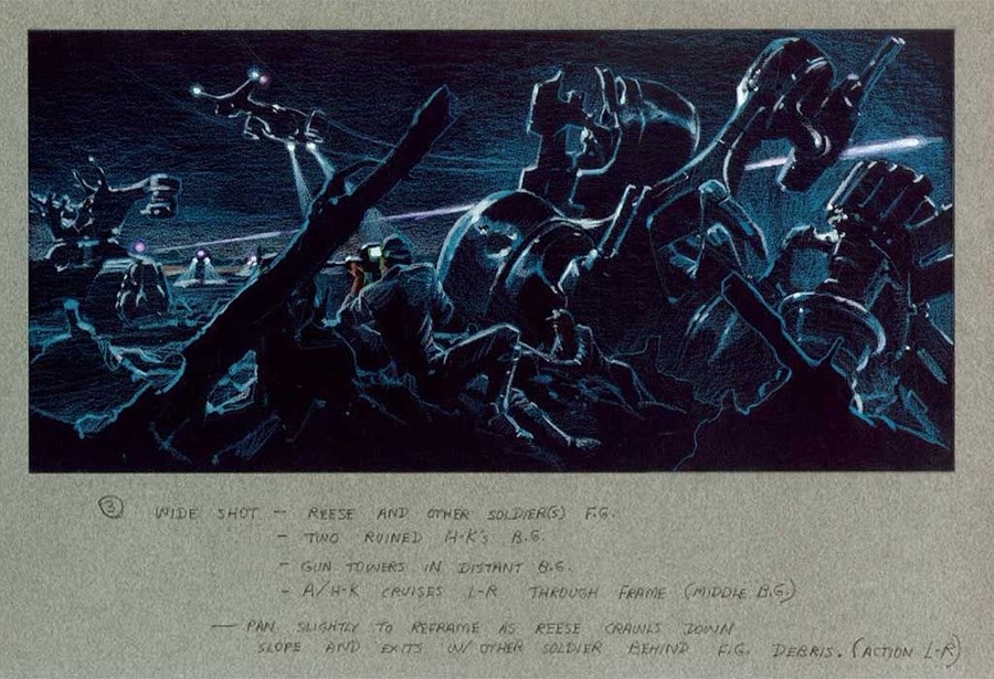 В первой части «Терминатора» (1984) похожие сцены Джеймс Кэмерон снимал довольно локально, с ограниченными ресурсами — используя покадровую анимацию эндоскелетов и миниатюры HK. В T2 масштаб значительно расширился. Тем не менее, вместо полного перехода на CGI (что в 1991 году было бы нереально для стольких шотов), Кэмерон задействовал классические методы комбинированных съёмок на более высоком уровне. Эффекты будущей войны курировала компания Fantasy II Film Effects под началом Джина Уоррена-мл. (он же соавтор «Оскара» за визуальные эффекты T2). Ключевые задачи легли на: супервайзера моделей Майкла Джойса (Michael Joyce), дизайнера техники Стива Берга (Steve Burg), пиротехника Джо Вискочила и ведущего оператора комбинированных съёмок Питера Кляйна (Peter Kleinow), известного аниматора. Также активно участвовала Stan Winston Studio, предоставив animatronic-эндоскелеты и другую практическую поддержку.
