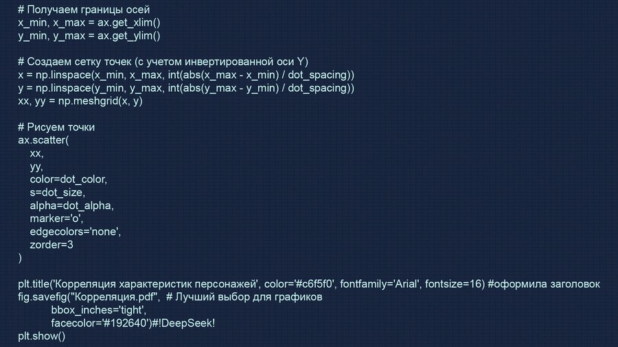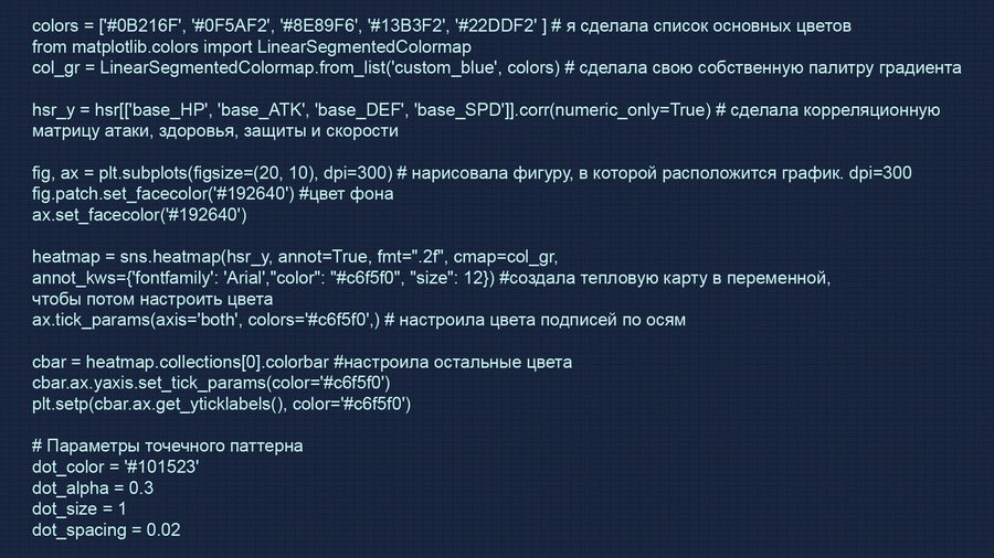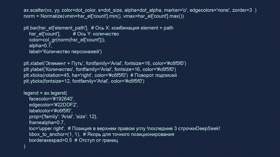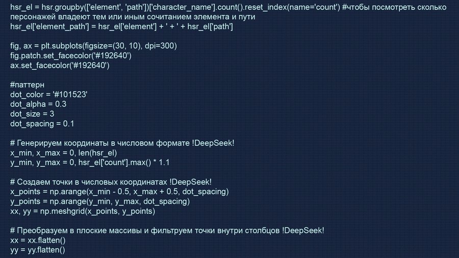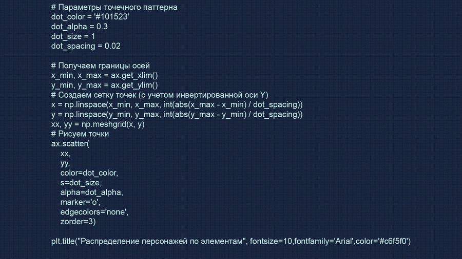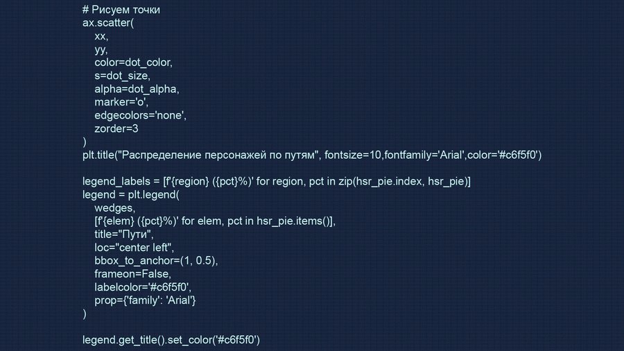 Оформление графиков вдохновлено игрой и официальным сайтом ХСР. Константы визуального стиля: Использование паттерна из точек. Шрифт — Arial. Цвета: fe2423, fee101, 0393d9, 5248c2, c7c7c7, 01c78a, #d04ddb Цвет фона: #192640 Цвет надписей: #c6f5f0