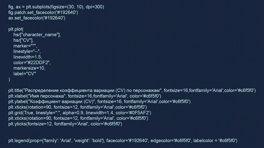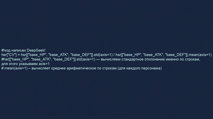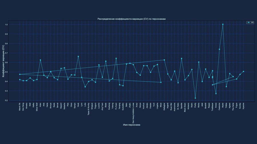 Теперь я решила выявить, какие персонажи наиболее сбалансированные. Это показалось трудной задачей, так что я обратилась к искусственному интеллекту, и он предложил мне посчитать коэффициент вариации (CV), то есть то, насколько в процентах числа отличаются от среднего значения. Чем меньше CV, тем более сбалансирован персонаж по силе, защите и здоровью (то есть значения всех трёх переменных примерно равны).