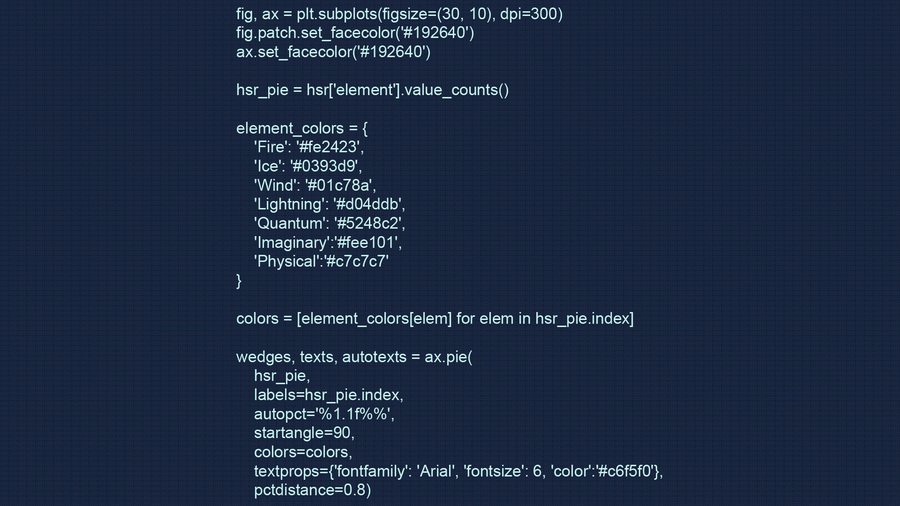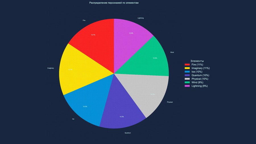 Последнее, что я решила узнать — это сколько раз какой путь и какой элемент встречается. Для этого создала 2 круговые диаграммы. Диаграмму с элементами покрасила в цвет, который используется для иконок элементов в игре.