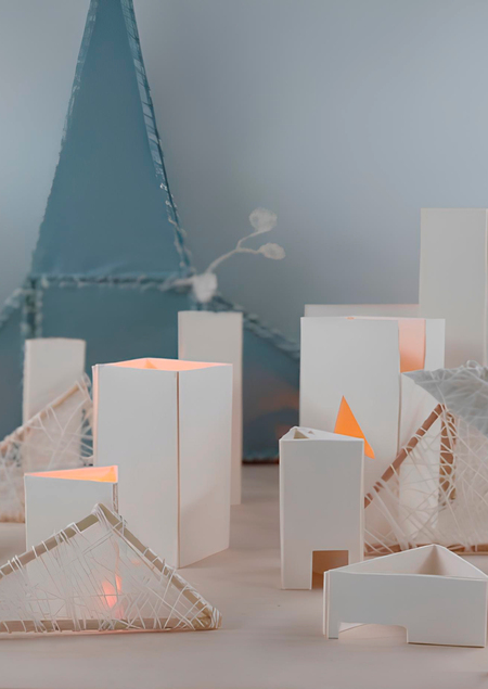 В композиционном центре возвышается абстрактная церковь, окруженная огнями. Небольшие домики из перегородок, с выемками на стенах, напоминают сказочную деревушку в сумраке. На создание макета меня вдохновили ночные образы Клее, мистические существа на картинах и ощущение «сноведения».