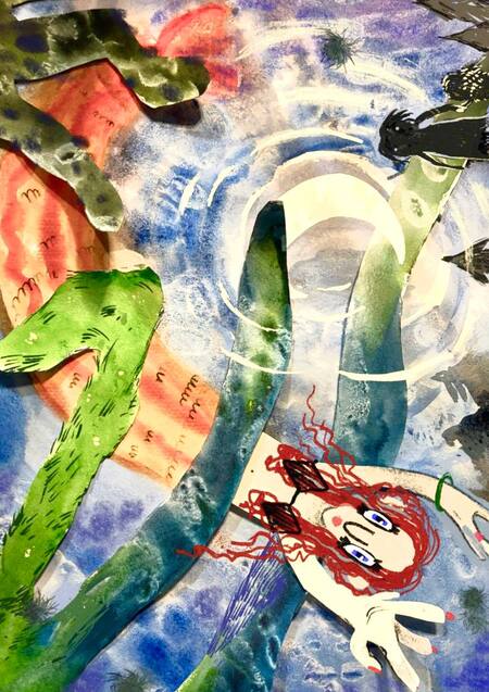 Для итогового проекта я выбрала технику коллаж-акварель. Мне показалось, что это может быть необычно и интересно, так как я ни разу не делала похожие работы. На протяжение модуля я вспоминала, как рисовать акварелью, потому что очень давно ей не работала. В своем проекте я хотела объединить загадочность с детской фантазией. Моя героиня — огромная фантазерка, после того, как она прочитала книгу, ей стали чудиться разные магические существа…такие как тролли.