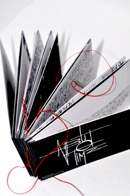Книжка в форме кадров, с каллиграфическими композициями из разговоров героев и их эмоционального состояния под воздействием внешних факторов. Дополнительные развороты — герой вернулся в то время и прожил его по-другому, поэтому оно немного видоизменено. Красная нить показывает беспорядочную жизнь героя на моменте понимания его собственной силы.