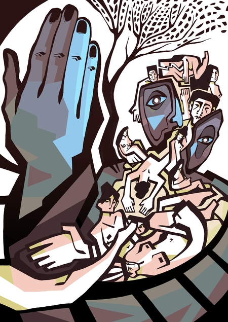 «Рассыпающиеся» — графическая серия из трёх иллюстраций, посвящённая утрате целостности и поиску себя. Статуи, некогда монолитные и вечные, рассыпаются, выпуская изнутри человеческие фигуры — метафору внутреннего «я», вырвавшегося наружу. Человек прорывается сквозь навязанные формы, обретая подлинную сущность.