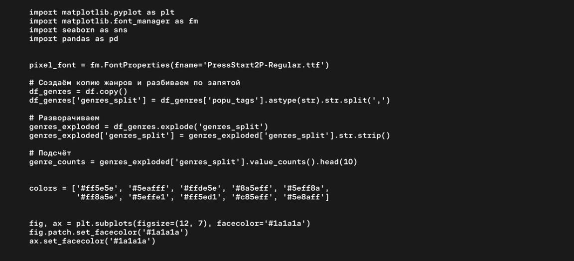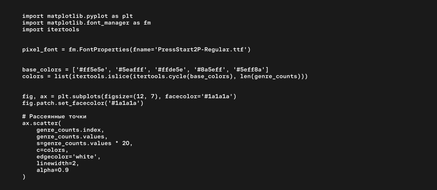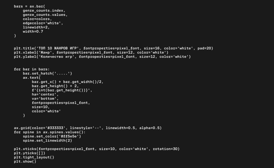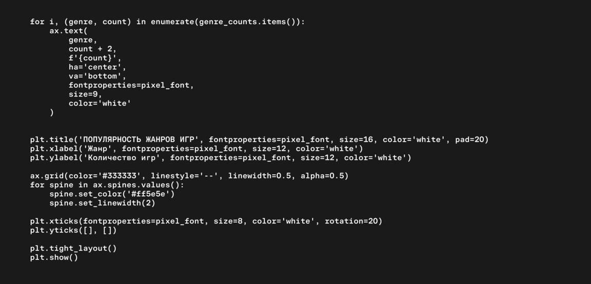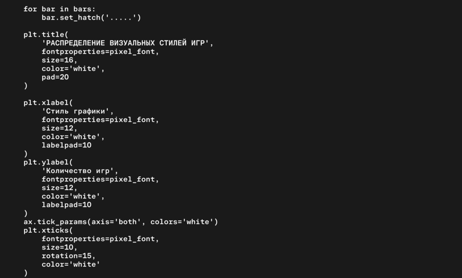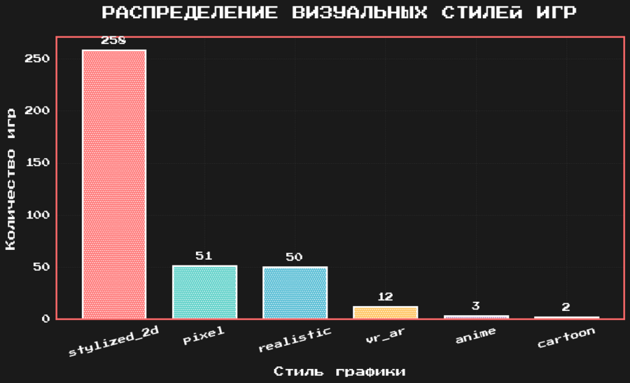 График демонстрирует, какие визуальные стили наиболее часто используются в играх. Это даёт представление о том, какие стилистики наиболее популярны у разработчиков и, возможно, у игроков.