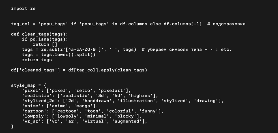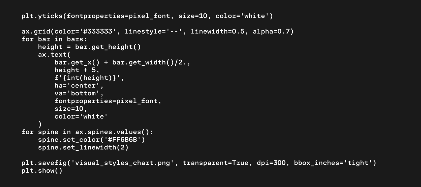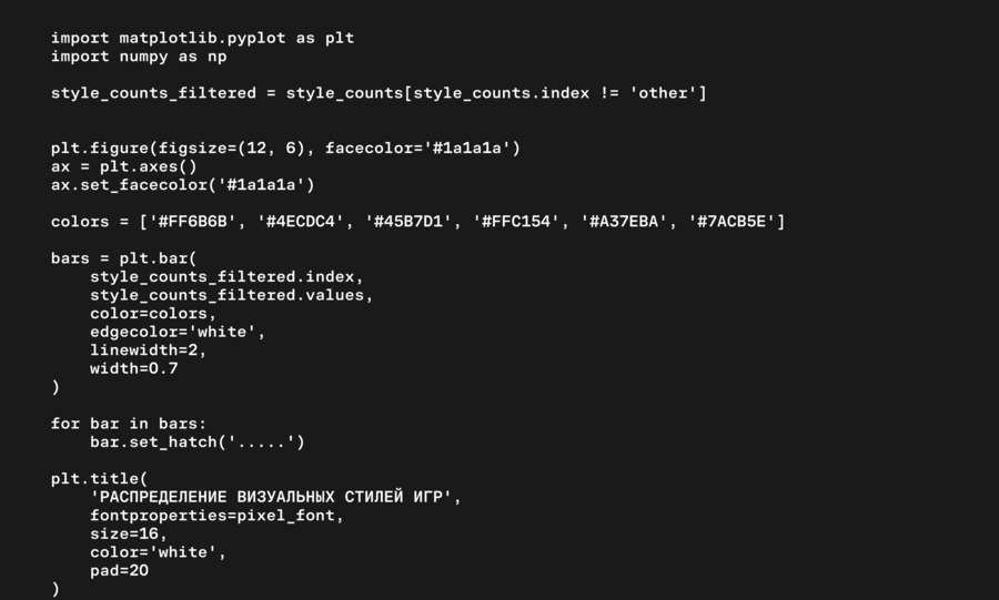 Некоторые стили (например, pixel art или realistic) встречаются заметно чаще других, что говорит о востребованности узнаваемых или олдскульных визуальных решений. Меньшее количество менее популярных стилей может говорить о нишевости или специфичности этих подходов.