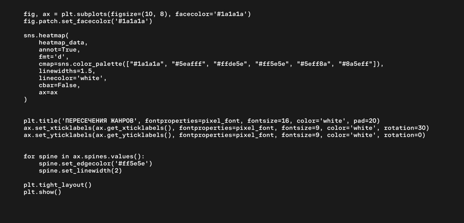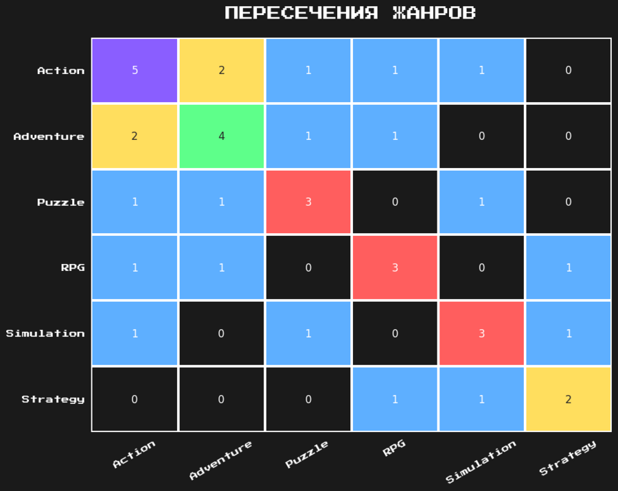 График показывает, что Action и Adventure являются не только самыми популярными жанрами, но и чаще всего сочетаются друг с другом. RPG и Puzzle занимают промежуточное положение, в то время как Strategy и Simulation более нишевые и редко сочетаются с другими жанрами. Это может быть полезно для анализа игровых предпочтений или при планировании разработки гибридных игр.