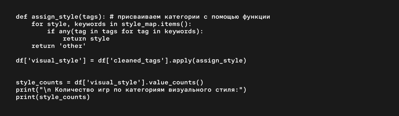 Также я принимаю решение ввести свои осмысленные визуальные категории, и потом распределять игры по ним на основе тегов, например: пиксельная графика (pixel, pixelart, retro) Реализм (realistic, 3D, HD) и т. д.