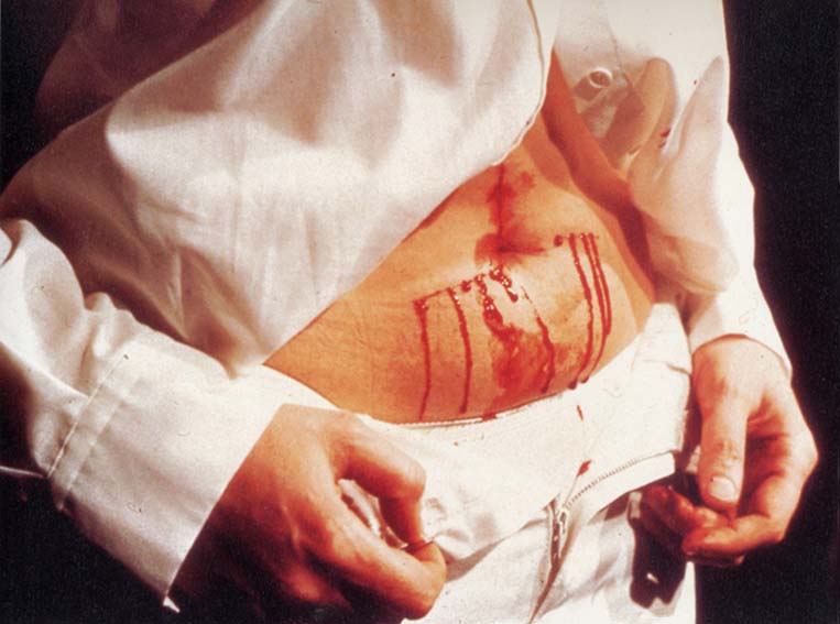 Уже обсуждался перформанс Вито Аккончи, в котором фотография служила дополнительным уровнем «отпечатывания» действий художника. Но такой вид насилия со стороны перформера и/или над ним — и так не самый радикальный из тех, что практиковались. Как раз в этом случае насилие и не оказывалось центральным содержанием акции.