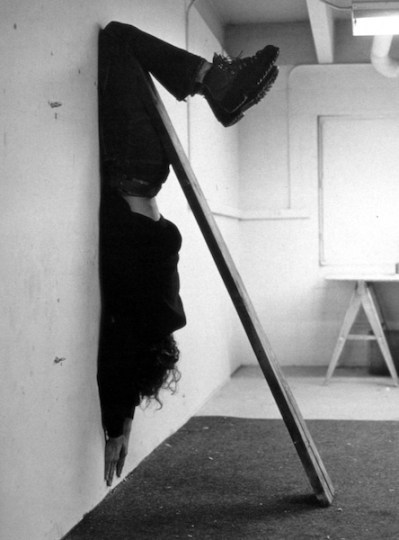 Например, снимки акции «Восхождение без анестезии», 1971 выставлялись в виде диптиха, где одна сторона была заполнена огромным количеством фотографий художницы в процессе осуществления перформанса (она поднималась по необычной решетке-лестнице, где каждая перекладина усеяна шипами), а другая сторона и была той самой лестницей.