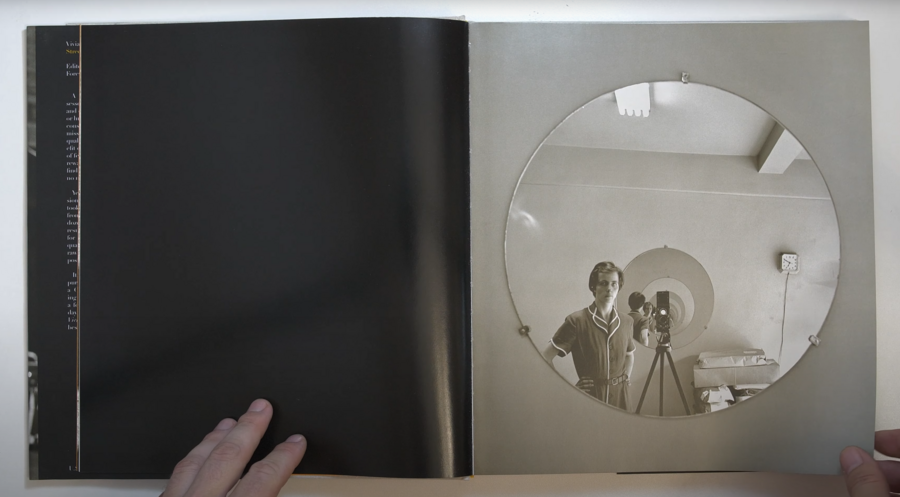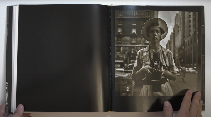 Также это прослеживается в разворотах с изображением автопортретов Вивиан, однако уже на черной заливке. Книга как открывается одностраничным автопортретом с черной заливкой, так и завершается, отдельной главой с ее автопортретами, символизируя обратную сторону кадров: черный фон, как символ того, что стоит за камерой, что находится в этой камере обскура, которая через свет транслировала нам все те отпечатки, что мы смогли увидеть ранее.