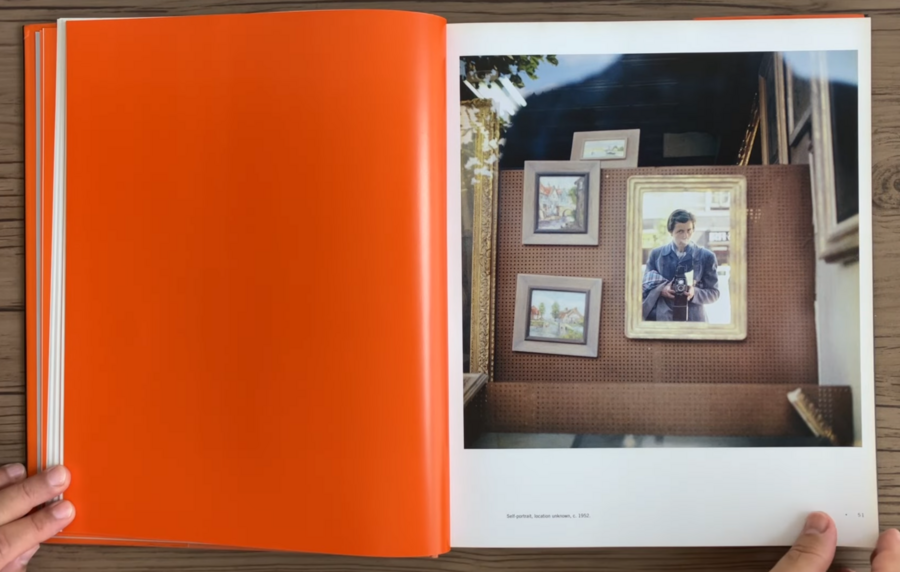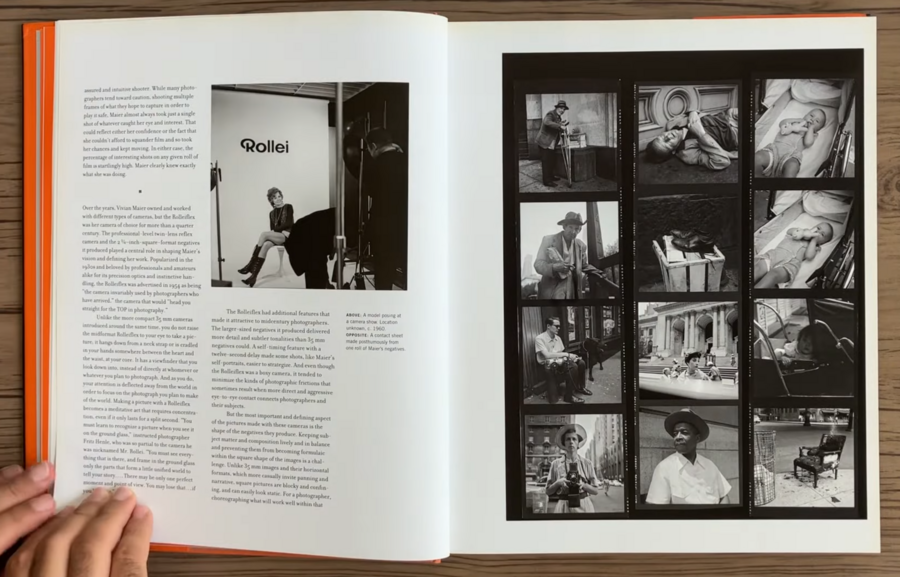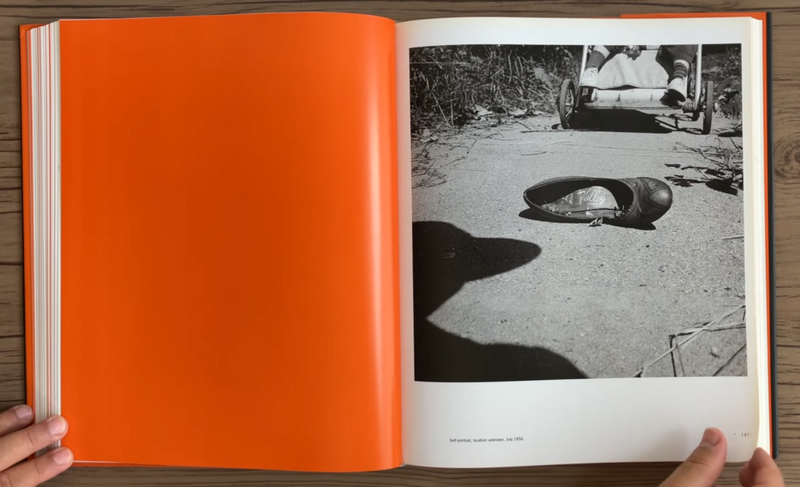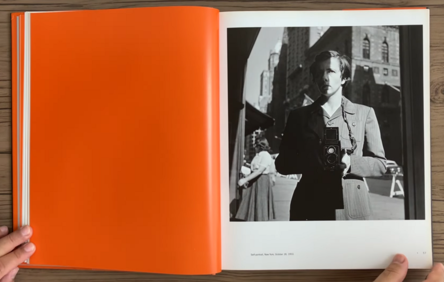 Для этой же цели встраиваются вновь однополосные автопортреты Вивиан с главной оранжевой фоновой заливкой. В этом есть свой особый шарм с резко неожиданными яркими разворотами, ведь именно так и происходит этот неожиданный мимолетный кадр, увиденной самой себя, среди всего того, что Вивиан всегда обозревала вокруг себя. Интересно как на одном из разворотов авторы книги заставляют напрячься и поиграть в прятки, словно сама Вивиан в роли няни играет с нами в детскую игру с читателем, привыкшим к ясным портретам Майер, найти ее саму в кадре.