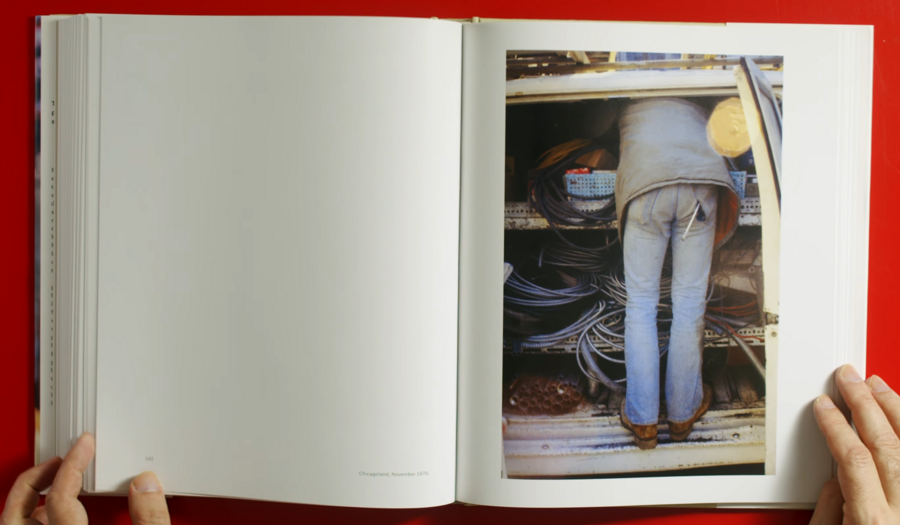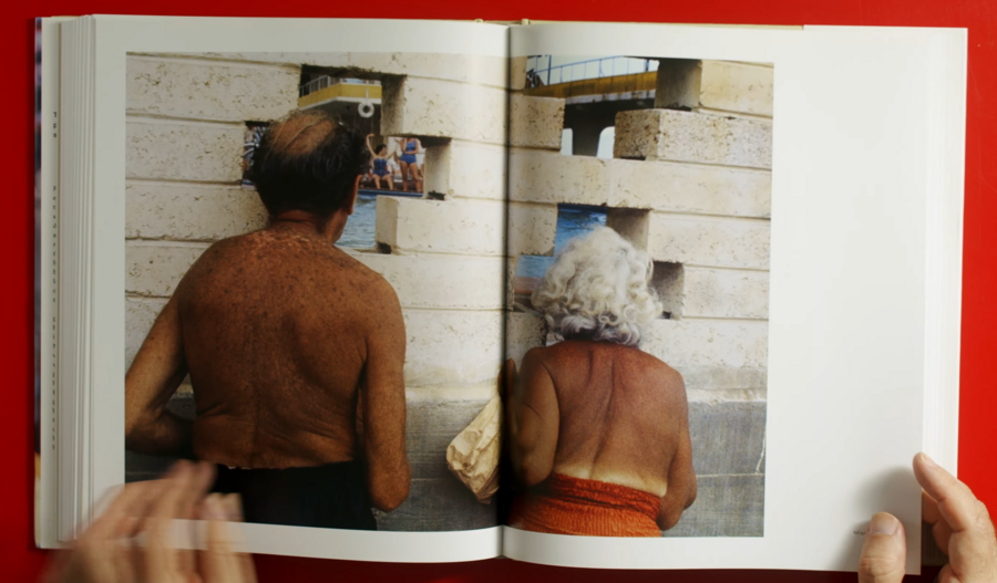 Стоит отметить, что перед каждой следующей группой тематических изображений встраивается кадр вне контекста для «выдоха» читателя, своего рода пауза перед следующей тематической группой разворотов (яркое изображение машины ниже). Далее в таком же ключе идут следующие группы разворотов: дети, портреты, витрины, люди смотрящие в один и тот же угол, уличные постеры, детали улицы, геометрия, игра цвета, люди, цветы, политическая повестка, люди, путешествие по другим странам, снова родные улицы.