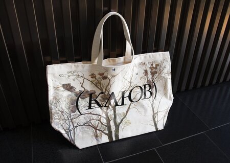 2. High-resolution mockup of a natural canvas tote bag, featuring a dark green, textured print of pine trees and a bird silhouette, inspired by the «GNEZDO Bird Park» aesthetic. The bag has a clean, slightly worn texture. It is suspended from a rustic, moss-covered tree branch in an atmospheric forest. The background is a softly focused, natural woodland scene with subtle light filtering through the trees and green patches on the forest floor. Professional product shot, outdoor setting.