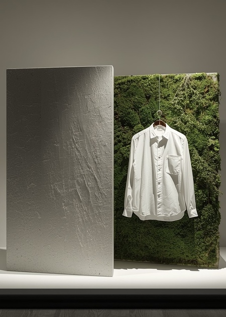 Я создаю среду для современного человека. Витрина становится местом диалога между архитектурной строгостью Дома и органичной жизнью Сада. Четкие геометрические формы создают основу композиции, а одежда интегрирована в эту среду как её естественная часть.