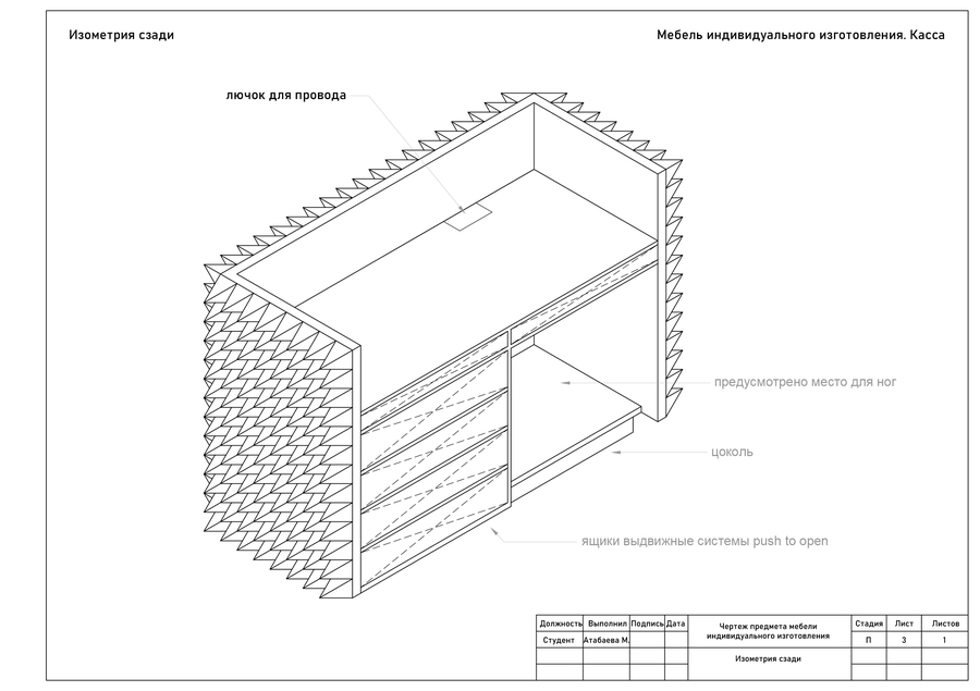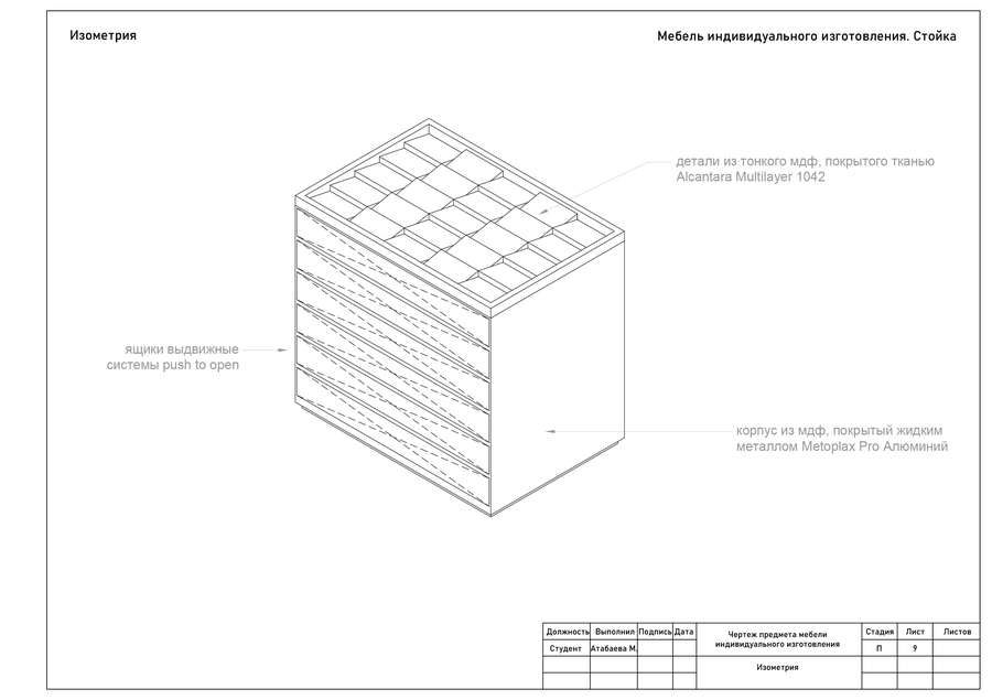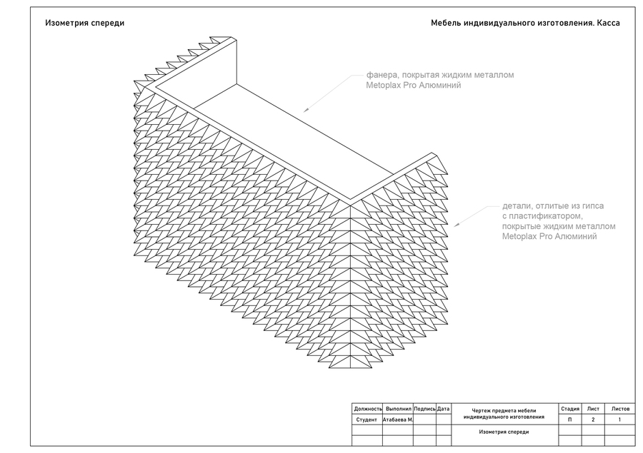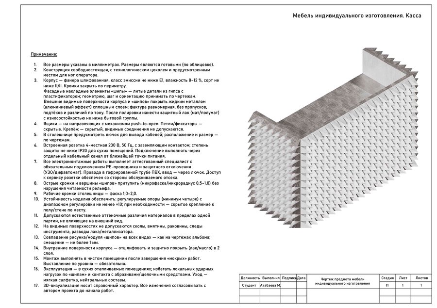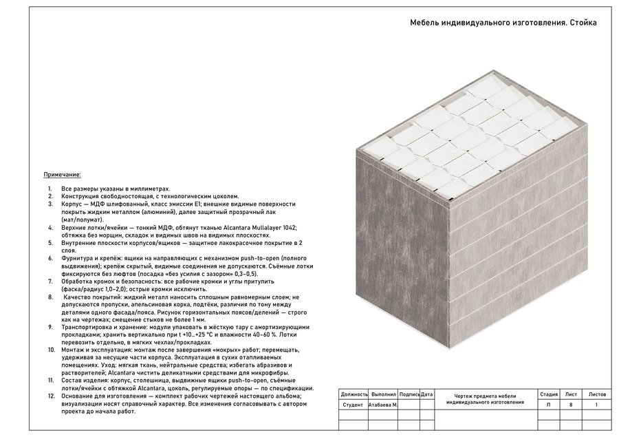 Мебель создана как продолжение эстетики украшений DETALI. В основе формы лег мотив шипов и остроконечной геометрии, перекликающийся с дизайном украшений бренда. Эти формы выражают энергию, которая чувствуется даже в статике. Целью было сделать мебель лаконичной, но при этом выразительной, с искрой. Острые элементы не агрессивны, они задают характер, который несёт бренд. Мебель DETALI существует в едином пространстве с украшениями. Она не отвлекает внимание, наоборот, она должна усиливать их энергию, отражая идею бренда.