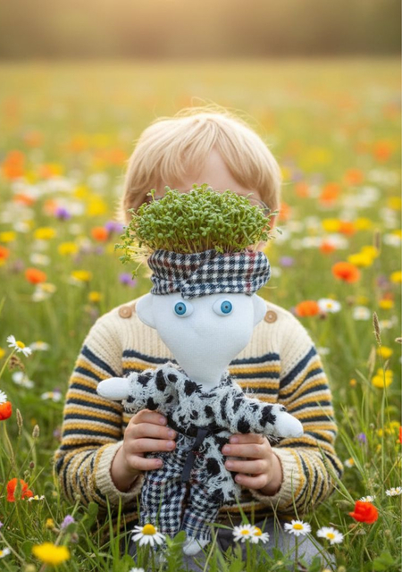 Эко-кукла с живыми волосами из кресс-салата — первый урок ответственности и любви к природе через игру. Ребенок выращивает «прическу», ухаживает за ней, а после надевает шляпу для бесконечных игр. Уникальный развивающий проект из экоматериалов