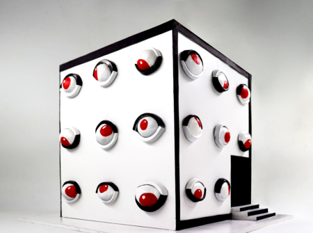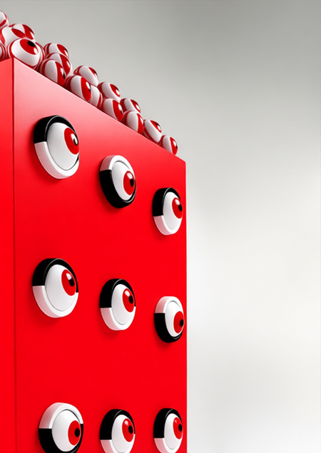 Prompt: A hyper-realistic, 3D-rendered bright red cube standing on a clean white surface against a soft gradient gray studio background. The cube is covered with dozens of cartoonish, glossy eyeballs — each with a white sclera, a vivid red iris, and a black pupil — arranged in neat rows across its visible faces. More eyeballs spill over the top edge of the cube, piled chaotically as if overflowing from within. Each eyeball has a subtle black rim or socket for depth, and they all gleam under soft, diffused studio lighting that creates gentle reflections and shadows. The style is surreal, playful, and slightly uncanny — blending pop art aesthetics with modern 3D product photography. Ultra-detailed, high-resolution, cinematic lighting, octane render.
