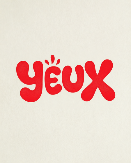 Prompt: Create a bold, retro-style logo with the word «YEUX» in vibrant red. The typography should be hand-drawn, bubbly, and slightly irregular — with rounded, organic letterforms that feel soft and tactile, like vintage candy or 1970s psychedelic signage. Add small decorative flourishes: above the «E», include three tiny curved lines or «eyelashes» to subtly hint at eyes (without literal eyeballs). Use a halftone dot texture within the red letters for a screen-printed, analog feel. Set the logo on a textured off-white or cream paper background to enhance the vintage aesthetic. Keep it minimalist, centered, and joyful — no extra elements, just the stylized wordmark. Style inspiration: mid-century graphic design meets pop art, with a touch of whimsy.