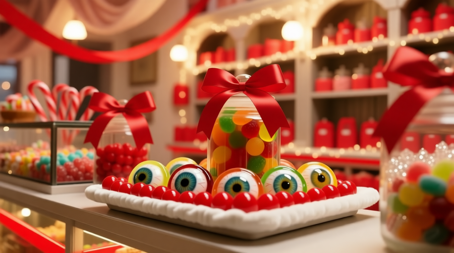 The setting is a cozy, nostalgic candy shop with wooden counters and shelves filled with colorful sweets. Behind her, large glass jars are overflowing with vibrant candies, including gummy bears, rainbow-striped lollipops, and whimsical eyeball-shaped candies. A modern black touchscreen cash register sits on the counter beside her. The shop is warmly lit by elegant pendant lights and wall sconces, and rich red velvet curtains frame a window in the background, adding to the charming, retro atmosphere. The overall mood is joyful, festive, and inviting.