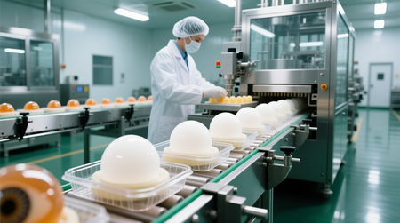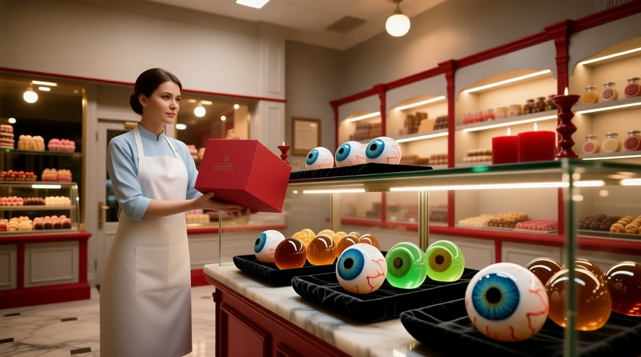 Prompt: A highly detailed, photorealistic industrial food production line in a sterile, modern factory. Stainless steel conveyor belts carry rows of glossy, dome-shaped «candies» designed to look exactly like human eyeballs — with realistic irises (blue, brown, green), black pupils, and white sclera, some with subtle red veins. In the foreground, one large orange-brown eyeball candy is slightly out of focus, drawing attention. A factory worker in full hygienic gear — white lab coat, hairnet, face mask, and gloves — stands beside the machinery, carefully inspecting or placing the eye-candies into clear plastic clamshell packaging. The background features more automated machinery, glass panels, and bright overhead fluorescent lighting reflecting off polished green floors. The atmosphere is clean, clinical, and slightly uncanny — blending high-tech manufacturing with surreal, pop-art-inspired confectionery design. Style: cinematic, ultra-sharp, 8K resolution, studio lighting.