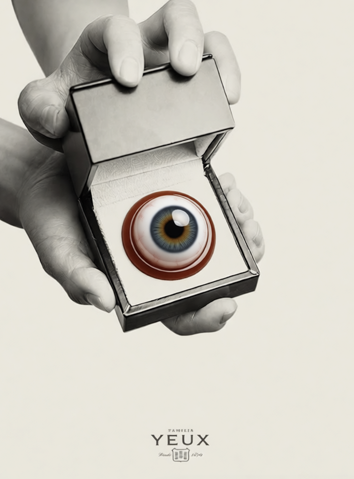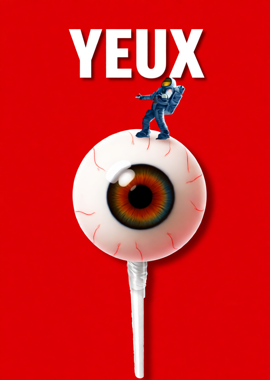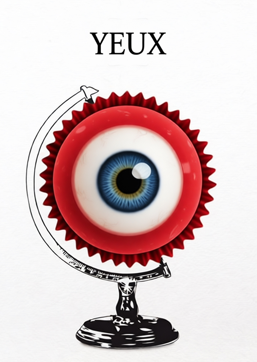 Prompt: A surreal, minimalist poster blending pop art and conceptual design. On a textured white background stands a globe—but instead of a world map, the sphere is a hyper-realistic human eyeball with a vivid blue iris, black pupil, and white sclera, rendered with lifelike detail and subtle light reflections. The eyeball is encircled by a bold, bright red scalloped or fluted rim resembling a decorative pastry mold or ornamental border. The globe’s skeletal frame is sketched in fine black-and-white lines, mimicking vintage cartographic details with faint labels and symbols. It rests on a sleek, glossy black pedestal that reflects the object above. Centered above the globe is the word «YEUX» in clean, uppercase sans-serif typography. The overall mood is enigmatic, artistic, and slightly unsettling—merging anatomical realism with surreal symbolism. Lighting is soft and studio-like, emphasizing depth, contrast, and the interplay of red, black, white, and blue.
