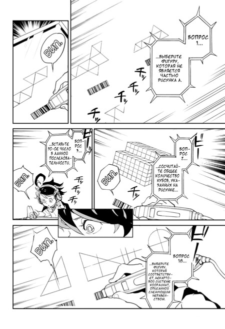 В представленных выше двух фрагментах представлено большое количество баллонов различных форм. Например, восклицания «Рей!», «Норман!» заключены в баллоны, напоминающие ромашки, через них выражаются эмоции, схожие с радостью. Затем, на кадре с тремя главными героями, на котором изображено негодование Эммы мы снова приходим к рваной, колючей форме, однако она немного сглаживается за следующем за ним кадром с мамой, что указывает на то, что они находятся поодаль друг от друга. То есть, это, фактически, изображение изменения громкости. На фрагменте справа можно заметить баллоны, границы которых объёмны и создают ощущение твёрдости и неизменности. Это интересный способ изображения аудиозаписи, проигрываемой в наушниках, которая по сути не является живой речью, а лишь её симуляцией; в ней нет места сентименту, так как это инструктаж на экзамене, и «шипы» на баллонах это подчёркивают. Также стоит обратить внимание на баллон для сканера, неодушевлённого предмета, который, по сути, является вариантом изображения звуковых эффектов, речь о которых пойдёт в следующем разделе исследования, однако здесь сразу хочется отметить точку после «бип», которая создаёт ощущение короткого звука.