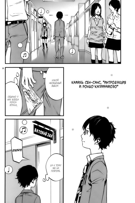 Самым популярным изообразом, конечно же, являются ноты. Однако это далеко не все способы изобразить музыку в манге. Проанализируем как музыка может проявляться в графике на примере манги Аракавы Наоси «Твоя апрельская ложь».