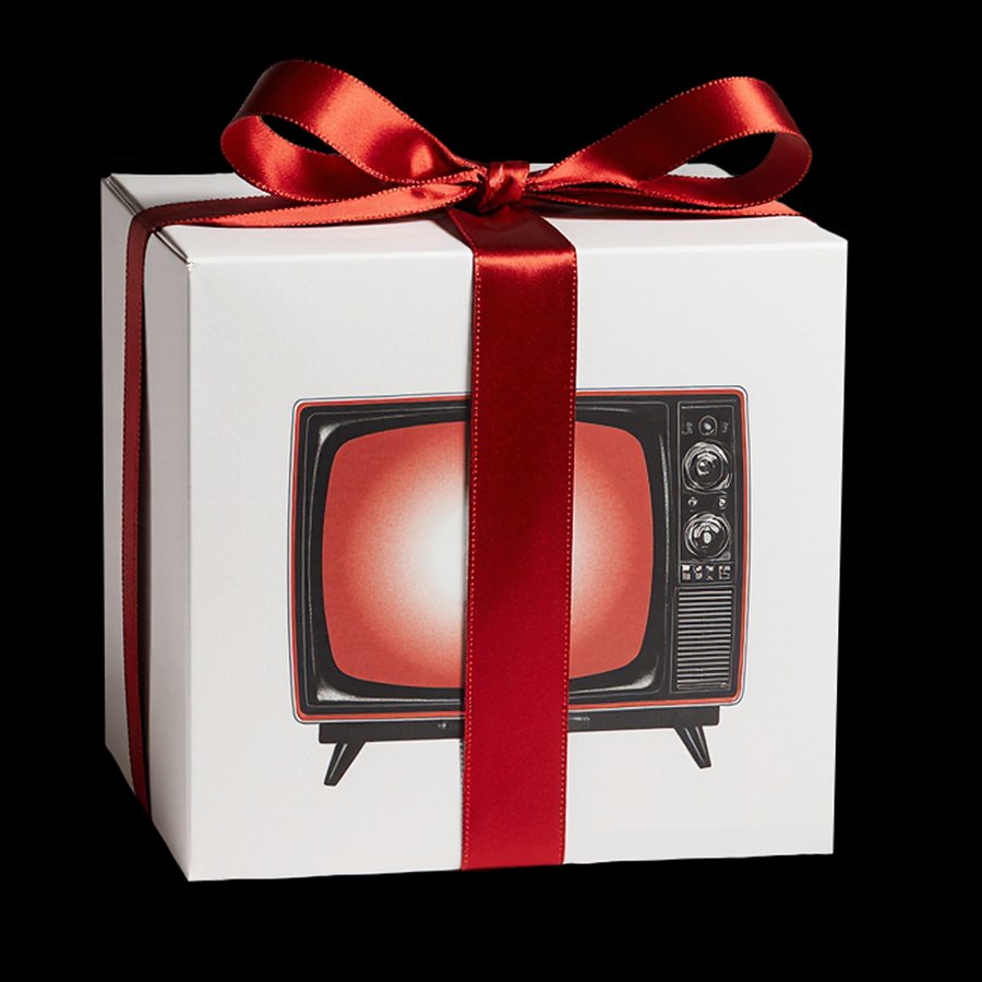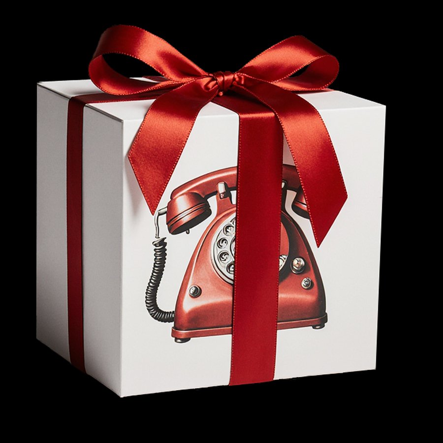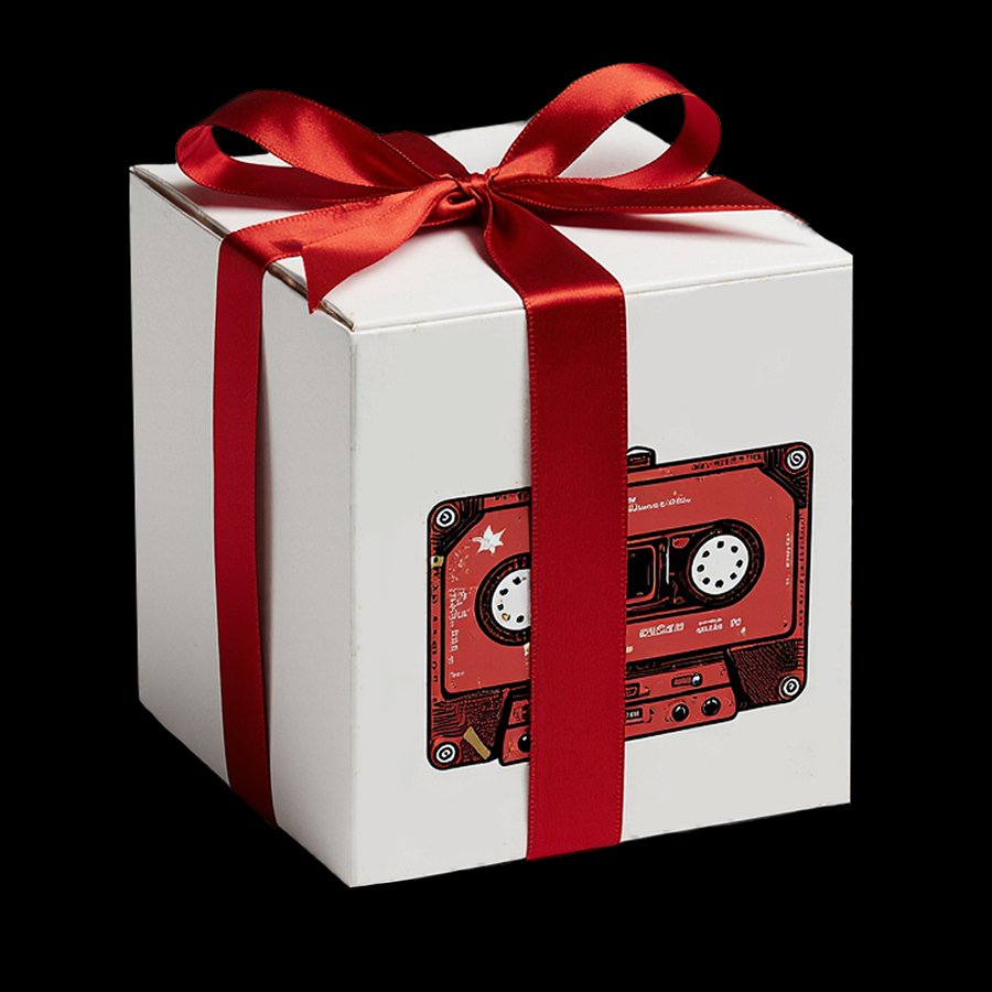Выполненная в новогодней палитре, коробка из плотного картона, перевязанная алым атласным бантом, украшена спереди стилизованным изображением ретро-гаджета, намекая на волшебный сюрприз внутри. Лаконичность и праздничные цвета создают предвкушение особенного подарка.