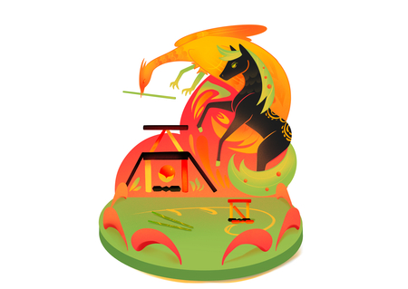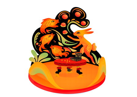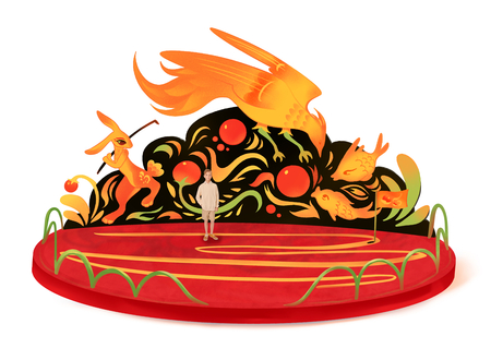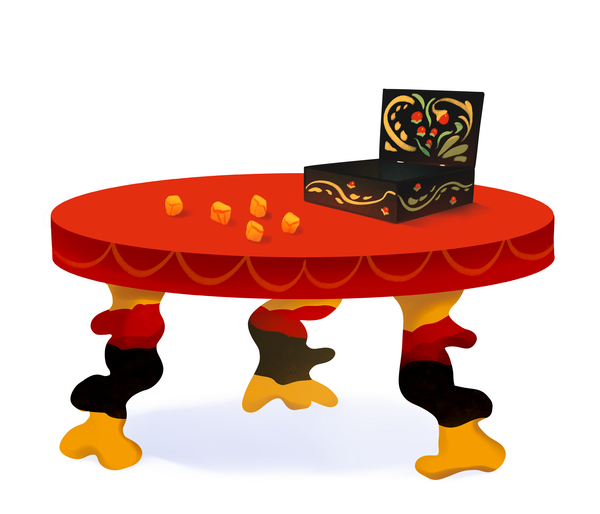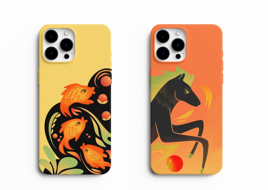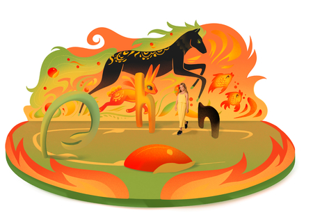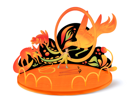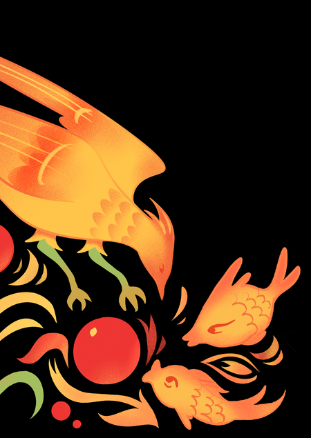 Проект состоит из 8 модульных иллюстраций, обрамляющих игровые зоны и стилизованного инвентаря под узорность хохломы.